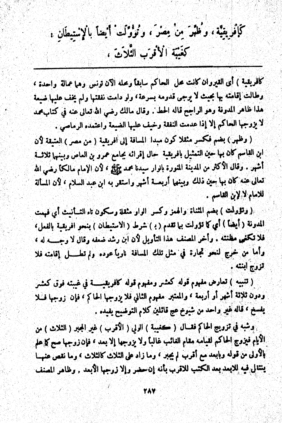 (وَظُهِّرَ) بِضَمٍّ فَكَسْرٍ مُثَقَّلًا كَوْنُ مَبْدَأِ الْمَسَافَةِ إلَى إفْرِيقِيَّةَ (مِنْ مِصْرَ) الْعَتِيقَةِ لِأَنَّ ابْنَ الْقَاسِمِ كَانَ بِهَا حِينَ التَّمْثِيلِ بِإِفْرِيقِيَّةَ حَالَ إقْرَائِهِ بِجَامِعِ عَمْرِو بْنِ الْعَاصِ وَبَيْنَهُمَا ثَلَاثَةُ أَشْهُرٍ. وَقَالَ الْأَكْثَرُ مِنْ الْمَدِينَةِ الْمُنَوَّرَةِ بِأَنْوَارِ سَيِّدِنَا مُحَمَّدٍ - صَلَّى اللَّهُ عَلَيْهِ وَسَلَّمَ - لِأَنَّ الْإِمَامَ مَالِكًا - رَضِيَ اللَّهُ تَعَالَى عَنْهُ - كَانَ بِهَا حِينَ ذَلِكَ وَبَيْنَهُمَا أَرْبَعَةُ أَشْهُرٍ وَاسْتَقَرَّ بِهِ ابْنُ عَبْدِ السَّلَامِ لِأَنَّ الْمَسْأَلَةَ لِلْإِمَامِ لَا لِابْنِ الْقَاسِمِ.