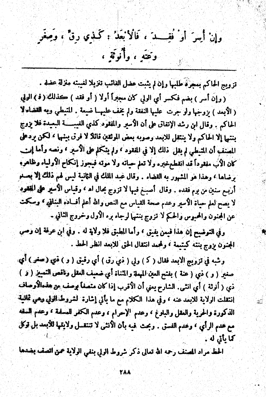 وَشَبَّهَ فِي تَزْوِيجِ الْأَبْعَدِ فَقَالَ (كَ) وَلِيٍّ (ذِي رِقٍّ) أَيْ رَقِيقٍ (وَ) ذِي (صِغَرٍ) أَيْ صَغِيرٍ (وَ) ذِي (عَتَهٍ) بِفَتْحِ الْعَيْنِ الْمُهْمَلَةِ وَالْمُثَنَّاةِ أَيْ ضَعِيفِ الْعَقْلِ وَنَاقِصِ التَّمْيِيزِ (وَ) ذِي (أُنُوثَةٍ) أَيْ أُنْثَى. الشَّارِحُ يَعْنِي أَنَّ الْأَقْرَبَ إذَا كَانَ مُتَّصِفًا بِوَصْفٍ مِنْ هَذِهِ الْأَوْصَافِ انْتَقَلَتْ الْوِلَايَةُ لِلْأَبْعَدِ عَنْهُ، وَفِي هَذَا الْكَلَامِ مَعَ مَا يَأْتِي إشَارَةٌ لِشُرُوطِ الْوَلِيِّ وَهِيَ ثَمَانِيَةٌ الذُّكُورَةُ وَالْحُرِّيَّةُ وَالْعَقْلُ وَالْبُلُوغُ، وَعَدَمُ الْإِحْرَامِ، وَعَدَمُ الْكُفْرِ لِلْمُسْلِمَةِ، وَعَدَمُ السَّفَهِ مَعَ عَدَمِ الرَّأْيِ، وَعَدَمُ الْفِسْقِ. وَبَحَثَ فِيهِ بِأَنَّ الْأُنْثَى لَا تَنْتَقِلُ وِلَايَتُهَا لِلْأَبْعَدِ بَلْ تُوَكِّلُ كَمَا يَأْتِي لَهُ.