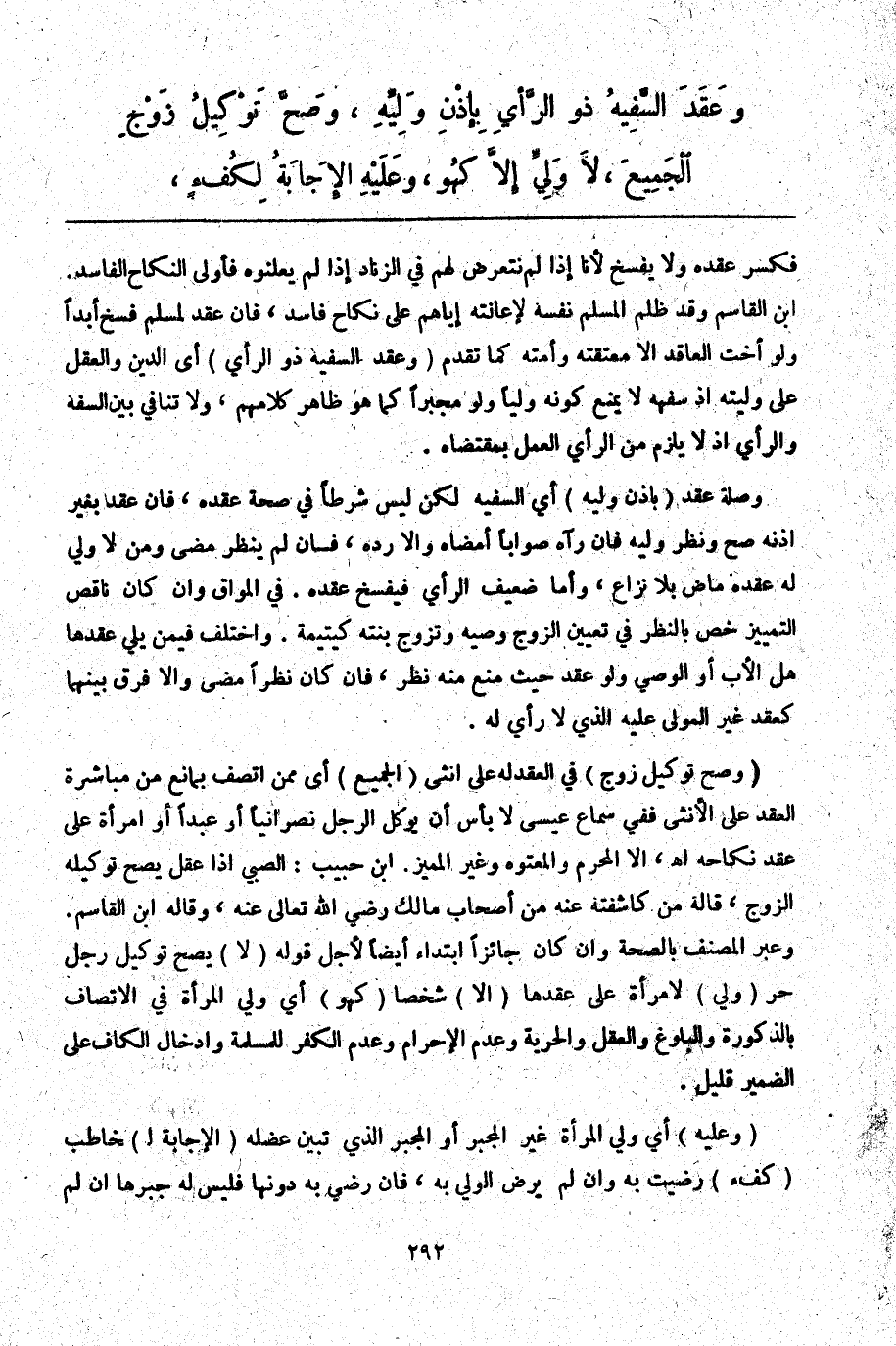 ابْنُ الْقَاسِمِ وَقَدْ ظَلَمَ الْمُسْلِمُ نَفْسَهُ لِإِعَانَتِهِ إيَّاهُمْ عَلَى نِكَاحٍ فَاسِدٍ، فَإِنْ عُقِدَ لِمُسْلِمٍ فُسِخَ أَبَدًا وَلَوْ أُخْتَ الْعَاقِدِ إلَّا مُعْتَقَتَهُ وَأَمَتَهُ كَمَا تَقَدَّمَ (وَعَقَدَ السَّفِيهُ ذُو الرَّأْيِ) أَيْ الدِّينِ وَالْعَقْلِ عَلَى وَلِيَّتِهِ إذْ سَفَهُهُ لَا يَمْنَعُ كَوْنَهُ وَلِيًّا وَلَوْ مُجْبِرًا كَمَا هُوَ ظَاهِرُ كَلَامِهِمْ، وَلَا تَنَافِيَ بَيْنَ السَّفَهِ وَالرَّأْيِ إذْ لَا يَلْزَمُ مِنْ الرَّأْيِ الْعَمَلُ بِمُقْتَضَاهُ.