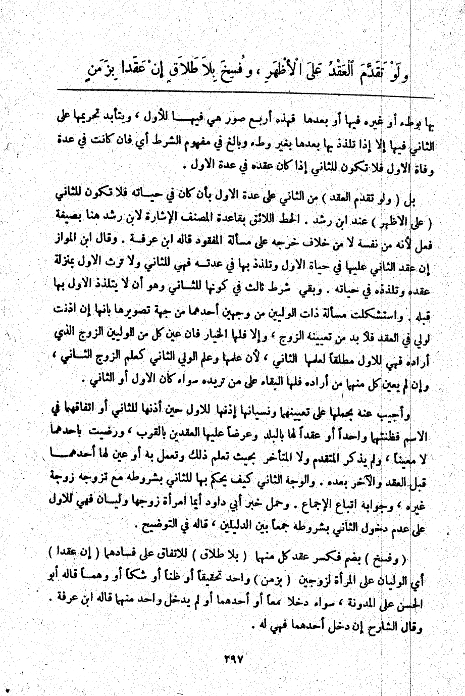 بَلْ (وَلَوْ تَقَدَّمَ الْعَقْدُ) مِنْ الثَّانِي عَلَى عِدَّةِ الْأَوَّلِ بِأَنْ كَانَ فِي حَيَاتِهِ فَلَا تَكُونُ لِلثَّانِي (عَلَى الْأَظْهَرِ) عِنْدَ ابْنِ رُشْدٍ. الْحَطُّ اللَّائِقُ بِقَاعِدَةِ الْمُصَنِّفِ الْإِشَارَةُ لِابْنِ رُشْدٍ هُنَا بِصِيغَةِ فَعَلَ لِأَنَّهُ مِنْ نَفْسِهِ لَا مِنْ خِلَافٍ خَرَّجَهُ عَلَى مَسْأَلَةِ الْمَفْقُودِ قَالَهُ ابْنُ عَرَفَةَ. وَقَالَ ابْنُ الْمَوَّازِ إنْ عَقَدَ الثَّانِي عَلَيْهَا فِي حَيَاةِ الْأَوَّلِ وَتَلَذَّذَ بِهَا فِي عِدَّتِهِ فَهِيَ لِلثَّانِي وَلَا تَرِثُ الْأَوَّلَ بِمَنْزِلَةِ عَقْدِهِ وَتَلَذُّذِهِ فِي حَيَاتِهِ. وَبَقِيَ شَرْطٌ ثَالِثٌ فِي كَوْنِهَا لِلثَّانِي وَهُوَ أَنْ لَا يَتَلَذَّذَ الْأَوَّلُ بِهَا قَبْلَهُ. وَاسْتُشْكِلَتْ مَسْأَلَةُ ذَاتِ الْوَلِيَّيْنِ مِنْ وَجْهَيْنِ: أَحَدُهُمَا مِنْ جِهَةِ تَصْوِيرِهَا بِأَنَّهَا إنْ أَذِنَتْ لِوَلِيٍّ فِي الْعَقْدِ فَلَا بُدَّ مِنْ تَعْيِينِهِ الزَّوْجَ، وَإِلَّا فَلَهَا الْخِيَارُ فَإِنْ عَيَّنَ كُلٌّ مِنْ الْوَلِيَّيْنِ الزَّوْجَ الَّذِي أَرَادَهُ فَهِيَ لِلْأَوَّلِ مُطْلَقًا لِعِلْمِهَا الثَّانِي لِأَنَّ عِلْمَهَا وَعِلْمَ الْوَلِيِّ الثَّانِي كَعِلْمِ الزَّوْجِ الثَّانِي، وَإِنْ لَمْ يُعَيِّنْ كُلٌّ مِنْهُمَا مَنْ أَرَادَهُ فَلَهَا الْبَقَاءُ عَلَى مَنْ تُرِيدُهُ سَوَاءٌ كَانَ الْأَوَّلَ أَوْ الثَّانِيَ.