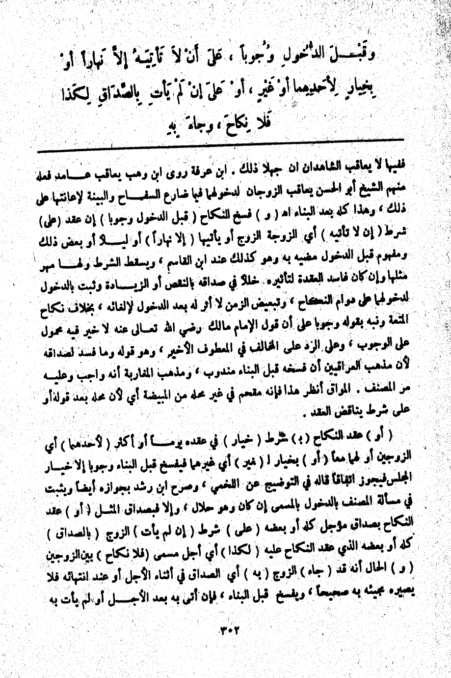 (وَ) فُسِخَ النِّكَاحُ (قَبْلَ الدُّخُولِ وُجُوبًا) إنْ عُقِدَ (عَلَى) شَرْطِ (أَنْ لَا تَأْتِيَهُ) أَيْ الزَّوْجَةُ الزَّوْجَ أَوْ يَأْتِيَهَا (إلَّا نَهَارًا) أَوْ لَيْلًا أَوْ بَعْضَ ذَلِكَ وَمَفْهُومُ قَبْلَ الدُّخُولِ مُضِيُّهُ بِهِ وَهُوَ كَذَلِكَ عِنْدَ ابْنِ الْقَاسِمِ، وَيَسْقُطُ الشَّرْطُ وَلَهَا مَهْرُ مِثْلِهَا وَإِنْ كَانَ فَاسِدَ الْعُقْدَةِ لِتَأْثِيرِهِ خَلَلًا فِي صَدَاقِهِ بِالنَّقْصِ أَوْ الزِّيَادَةِ، وَثَبَتَ بِالدُّخُولِ لِدُخُولِهِمَا عَلَى دَوَامِ النِّكَاحِ، وَتَبْعِيضُ الزَّمَنِ لَا أَثَرَ لَهُ بَعْدَ الدُّخُولِ لِإِلْغَائِهِ، بِخِلَافِ نِكَاحِ الْمُتْعَةِ وَنَبَّهَ بِقَوْلِهِ وُجُوبًا عَلَى أَنَّ قَوْلَ الْإِمَامِ مَالِكٍ - رَضِيَ اللَّهُ تَعَالَى عَنْهُ - لَا خَيْرَ فِيهِ مَحْمُولٌ عَلَى الْوُجُوبِ، وَعَلَى الرَّدِّ عَلَى الْمُخَالِفِ فِي الْمَعْطُوفِ الْأَخِيرِ، وَهُوَ قَوْلُهُ وَمَا فَسَدَ لِصَدَاقِهِ لِأَنَّ مَذْهَبَ الْعِرَاقِيِّينَ أَنَّ فَسْخَهُ قَبْلَ الْبِنَاءِ مَنْدُوبٌ، وَمَذْهَبَ الْمَغَارِبَةِ أَنَّهُ وَاجِبٌ وَعَلَيْهِ مَرَّ الْمُصَنِّفُ. الْمَوَّاقُ اُنْظُرْ هَذَا فَإِنَّهُ مُقْحَمٌ فِي غَيْرِ مَحَلِّهِ مِنْ الْمُبَيَّضَةِ أَيْ لِأَنَّ مَحَلَّهُ بَعْدَ قَوْلِهِ أَوْ عَلَى شَرْطٍ يُنَاقِضُ الْعَقْدَ.