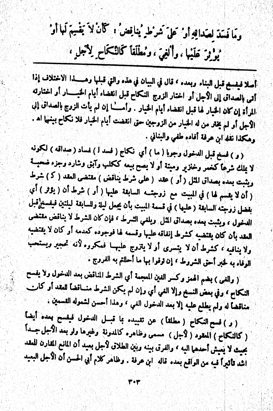 (وَ) فُسِخَ قَبْلَ الدُّخُولِ وُجُوبًا (مَا) أَيْ نِكَاحٌ (فَسَدَ لِ) فَسَادِ (صَدَاقِهِ) لِكَوْنِهِ لَا يُمْلَكُ شَرْعًا كَخَمْرٍ وَخِنْزِيرٍ وَمَيْتَةٍ أَوْ لَا يَصِحُّ بَيْعُهُ كَكَلْبٍ وَآبِقٍ وَشَارِدٍ وَجُزْءِ ضَحِيَّةٍ وَيَثْبُتُ بَعْدَهُ بِصَدَاقِ الْمِثْلِ (أَوْ) عُقِدَ (عَلَى شَرْطٍ يُنَاقِضُ) مُقْتَضَى الْعَقْدِ (كَ) شَرْطِ (أَنْ لَا يَقْسِمَ لَهَا) فِي الْمَبِيتِ مَعَ زَوْجَتِهِ السَّابِقَةِ عَلَيْهَا (أَوْ) شَرْطِ أَنْ (يُؤْثِرَ) أَيْ يُفَضِّلَ زَوْجَتَهُ السَّابِقَةَ (عَلَيْهَا) فِي قِسْمَةِ الْمَبِيتِ بِأَنْ يَجْعَلَ لَيْلَةً وَلِلسَّابِقَةِ لَيْلَتَيْنِ فَيُفْسَخُ قَبْلَ الدُّخُولِ، وَيَثْبُتُ بَعْدَهُ بِصَدَاقِ الْمِثْلِ وَيُلْغَى الشَّرْطُ، فَإِنْ كَانَ الشَّرْطُ لَا يُنَاقِضُ مُقْتَضَى الْعَقْدِ بِأَنْ كَانَ يَقْتَضِيهِ كَشَرْطِ إنْفَاقِهِ عَلَيْهَا وَقَسْمِهِ لَهَا فَوُجُودُهُ كَعَدَمِهِ أَوْ كَانَ لَا يَقْتَضِيهِ وَلَا يُنَافِيهِ، كَشَرْطِ أَنْ لَا يَتَسَرَّى أَوْ لَا يَتَزَوَّجَ عَلَيْهَا فَمَكْرُوهٌ لِأَنَّهُ تَحْجِيرٌ وَيُسْتَحَبُّ الْوَفَاءُ بِهِ لِخَبَرِ «أَحَقُّ الشُّرُوطِ، أَنْ تُوفُوا بِهَا مَا أَحْلَلْتُمْ بِهِ الْفُرُوجَ» .