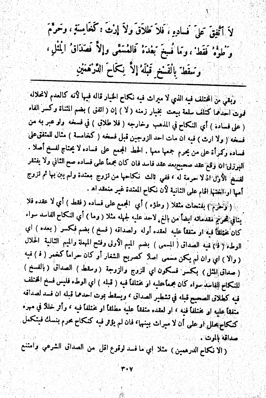 (وَحَرَّمَ) بِفَتَحَاتٍ مُثَقَّلًا (وَطْؤُهُ) أَيْ الْمُجْمَعِ عَلَى فَسَادِهِ (فَقَطْ) أَيْ لَا عَقْدُهُ فَلَا يُنَافِي تَحْرِيمَ مُقَدِّمَاتِهِ أَيْضًا مِنْ بَالِغٍ لَا حَدَّ عَلَيْهِ لِجَهْلِهِ مَثَلًا (وَمَا) أَيْ النِّكَاحُ الْفَاسِدُ سَوَاءٌ كَانَ مُخْتَلَفًا فِيهِ أَوْ مُتَّفَقًا عَلَيْهِ لِعَقْدِهِ أَوْ لَهُ وَلِصَدَاقِهِ (فُسِخَ) بِضَمٍّ فَكَسْرٍ (بَعْدَهُ) أَيْ الْوَطْءِ (فَ) فِيهِ الصَّدَاقُ (الْمُسَمَّى) بِضَمِّ الْمِيمِ الْأُولَى وَفَتْحِ الْمُهْمَلَةِ وَالْمِيمِ الثَّانِيَةِ الْحَلَالُ (وَإِلَّا) أَيْ وَإِنْ لَمْ يَكُنْ مُسَمًّى أَصْلًا كَصَرِيحِ الشِّغَارِ أَوْ كَانَ حَرَامًا كَخَمْرٍ (فَ) فِيهِ (صَدَاقُ الْمِثْلِ) بِكَسْرٍ فَسُكُونٍ أَيْ لِلزَّوْجِ وَالزَّوْجَةِ (وَسَقَطَ) الصَّدَاقُ (بِالْفَسْخِ) لِلنِّكَاحِ الْفَاسِدِ سَوَاءٌ كَانَ مُجْمَعًا عَلَيْهِ أَوْ مُخْتَلَفًا فِيهِ (قَبْلَهُ) أَيْ الْوَطْءِ فَلَيْسَ فَسْخُ الْمُخْتَلَفِ فِيهِ كَطَلَاقِ الصَّحِيحِ قَبْلَهُ فِي تَشْطِيرِ الصَّدَاقِ، وَيَسْقُطُ بِمَوْتِ أَحَدِهِمَا قَبْلَهُ إنْ فَسَدَ لِصَدَاقِهِ مُتَّفَقًا عَلَيْهِ أَوْ مُخْتَلَفًا فِيهِ، أَوْ لِعَقْدِهِ مُتَّفَقًا عَلَيْهِ مُطْلَقًا أَوْ مُخْتَلَفًا فِيهِ، وَأَثَّرَ خَلَلًا فِي مَهْرِهِ كَنِكَاحِ مُحَلِّلٍ أَوْ عَلَى أَنْ لَا مِيرَاثَ بَيْنَهُمَا، فَإِنْ لَمْ يُؤَثِّرْ فِيهِ كَنِكَاحِ مُحْرِمٍ بِنُسُكٍ فَيَتَكَمَّلُ صَدَاقُهُ بِالْمَوْتِ. (إلَّا نِكَاحُ الدِّرْهَمَيْنِ) مَثَلًا أَيْ مَا فَسَدَ لِوُقُوعِ أَقَلَّ مِنْ الصَّدَاقِ الشَّرْعِيِّ وَامْتَنَعَ