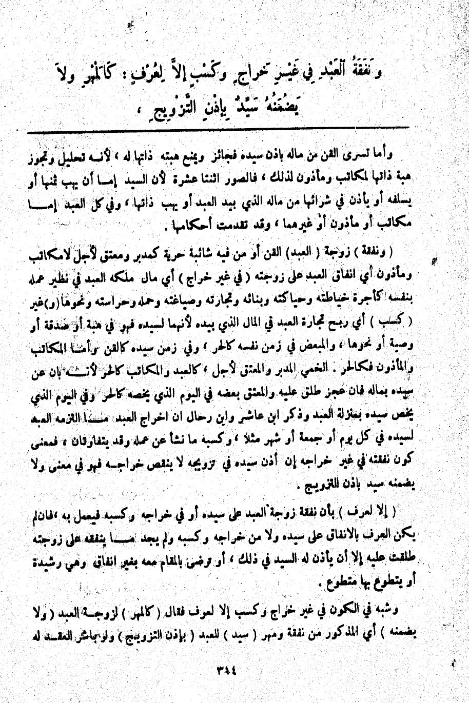 (وَنَفَقَةُ) زَوْجَةِ (الْعَبْدِ) الْقِنِّ أَوْ مَنْ فِيهِ شَائِبَةُ حُرِّيَّةٍ كَمُدَبَّرٍ وَمُعْتَقٍ لِأَجَلٍ لَا مُكَاتَبٍ وَمَأْذُونٍ أَيْ إنْفَاقُ الْعَبْدِ عَلَى زَوْجَتِهِ (فِي غَيْرِ خَرَاجٍ) أَيْ مَالٍ مَلَكَهُ الْعَبْدُ فِي نَظِيرِ عَمَلِهِ بِنَفْسِهِ كَأُجْرَةِ خِيَاطَتِهِ وَحِيَاكَتِهِ وَبِنَائِهِ وَتِجَارَتِهِ وَصِيَاغَتِهِ وَحَمْلِهِ وَحِرَاسَتِهِ وَنَحْوِهَا (وَ) غَيْرِ (كَسْبٍ) أَيْ رِبْحِ تِجَارَةِ الْعَبْدِ فِي الْمَالِ الَّذِي بِيَدِهِ لِأَنَّهُمَا لِسَيِّدِهِ فَهُوَ فِي هِبَةٍ أَوْ صَدَقَةٍ أَوْ وَصِيَّةٍ أَوْ نَحْوِهَا، وَالْمُبَعَّضُ فِي زَمَنِ نَفْسِهِ كَالْحُرِّ، وَفِي زَمَنِ سَيِّدِهِ كَالْقِنِّ وَأَمَّا الْمُكَاتَبُ وَالْمَأْذُونُ فَكَالْحُرِّ. اللَّخْمِيُّ الْمُدَبَّرُ وَالْمُعْتَقُ لِأَجَلٍ كَالْعَبْدِ وَالْمُكَاتَبُ كَالْحُرِّ لِأَنَّهُ بَانَ عَنْ سَيِّدِهِ بِمَالِهِ فَإِنْ عَجَزَ طَلَّقَ عَلَيْهِ، وَالْمُعْتَقُ بَعْضُهُ فِي الْيَوْمِ الَّذِي يَخُصُّهُ كَالْحُرِّ وَفِي الْيَوْمِ الَّذِي يَخُصُّ سَيِّدَهُ بِمَنْزِلَةِ الْعَبْدِ وَذَكَرَ ابْنُ عَاشِرٍ وَابْنُ رَحَّالٍ أَنَّ إخْرَاجَ الْعَبْدِ مَا الْتَزَمَهُ الْعَبْدُ لِسَيِّدِهِ فِي كُلِّ يَوْمٍ أَوْ جُمُعَةٍ أَوْ شَهْرٍ مَثَلًا، وَكَسْبُهُ مَا نَشَأَ عَنْ عَمَلِهِ وَقَدْ يَتَفَاوَتَانِ، فَمَعْنَى كَوْنِ نَفَقَتِهِ فِي غَيْرِ خَرَاجِهِ أَنَّ إذْنَ سَيِّدِهِ فِي تَزْوِيجِهِ لَا يُنْقِصُ خَرَاجَهُ فَهُوَ فِي مَعْنَى وَلَا يَضْمَنُهُ سَيِّدٌ بِإِذْنِ التَّزْوِيجِ.