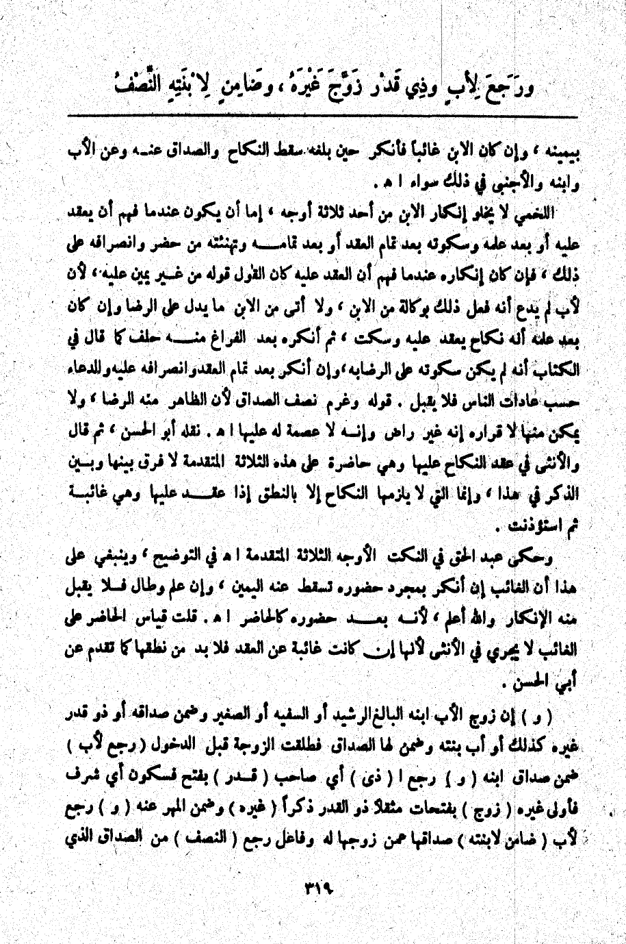 اللَّخْمِيُّ لَا يَخْلُو إنْكَارُ الِابْنِ مِنْ أَحَدِ ثَلَاثَةِ أَوْجُهٍ، إمَّا أَنْ يَكُونَ عِنْدَمَا فَهِمَ أَنْ يَعْقِدَ عَلَيْهِ أَوْ بَعْدَ عِلْمِهِ وَسُكُوتِهِ بَعْدَ تَمَامِ الْعَقْدِ أَوْ بَعْدَ تَمَامِهِ وَتَهْنِئَتِهِ مَنْ حَضَرَ وَانْصِرَافِهِ عَلَى ذَلِكَ، فَإِنْ كَانَ إنْكَارُهُ عِنْدَمَا فَهِمَ أَنَّ الْعَقْدَ عَلَيْهِ كَانَ الْقَوْلُ قَوْلَهُ مِنْ غَيْرِ يَمِينٍ عَلَيْهِ، لِأَنَّ الْأَبَ لَمْ يَدَّعِ أَنَّهُ فَعَلَ ذَلِكَ بِوَكَالَةٍ مِنْ الِابْنِ، وَلَا أَتَى مِنْ الِابْنِ مَا يَدُلُّ عَلَى الرِّضَا، وَإِنْ كَانَ بَعْدَ عِلْمِهِ أَنَّهُ نِكَاحٌ بِعَقْدٍ عَلَيْهِ وَسَكَتَ، ثُمَّ أَنْكَرَهُ بَعْدَ الْفَرَاغِ مِنْهُ حَلَفَ كَمَا قَالَ فِي الْكِتَابِ أَنَّهُ لَمْ يَكُنْ سُكُوتُهُ عَلَى الرِّضَا بِهِ، وَإِنْ أَنْكَرَ بَعْدَ تَمَامِ الْعَقْدِ وَانْصِرَافِهِ عَلَيْهِ وَالدُّعَاءِ حَسَبِ عَادَاتِ النَّاسِ فَلَا يُقْبَلُ قَوْلُهُ وَغَرِمَ نِصْفَ الصَّدَاقِ لِأَنَّ الظَّاهِرَ مِنْهُ الرِّضَا، وَلَا يُمَكَّنُ مِنْهَا لِإِقْرَارِهِ أَنَّهُ غَيْرُ رَاضٍ وَإِنَّهُ لَا عِصْمَةَ لَهُ عَلَيْهَا اهـ. نَقَلَهُ أَبُو الْحَسَنِ، ثُمَّ قَالَ وَالْأُنْثَى فِي عَقْدِ النِّكَاحِ عَلَيْهَا وَهِيَ حَاضِرَةٌ عَلَى هَذِهِ الثَّلَاثَةِ الْمُتَقَدِّمَةِ لَا فَرْقَ بَيْنَهَا وَبَيْنَ الذَّكَرِ فِي هَذَا، وَإِنَّمَا الَّتِي لَا يَلْزَمُهَا النِّكَاحُ إلَّا بِالنُّطْقِ إذَا عُقِدَ عَلَيْهَا وَهِيَ غَائِبَةٌ ثُمَّ اُسْتُؤْذِنَتْ.