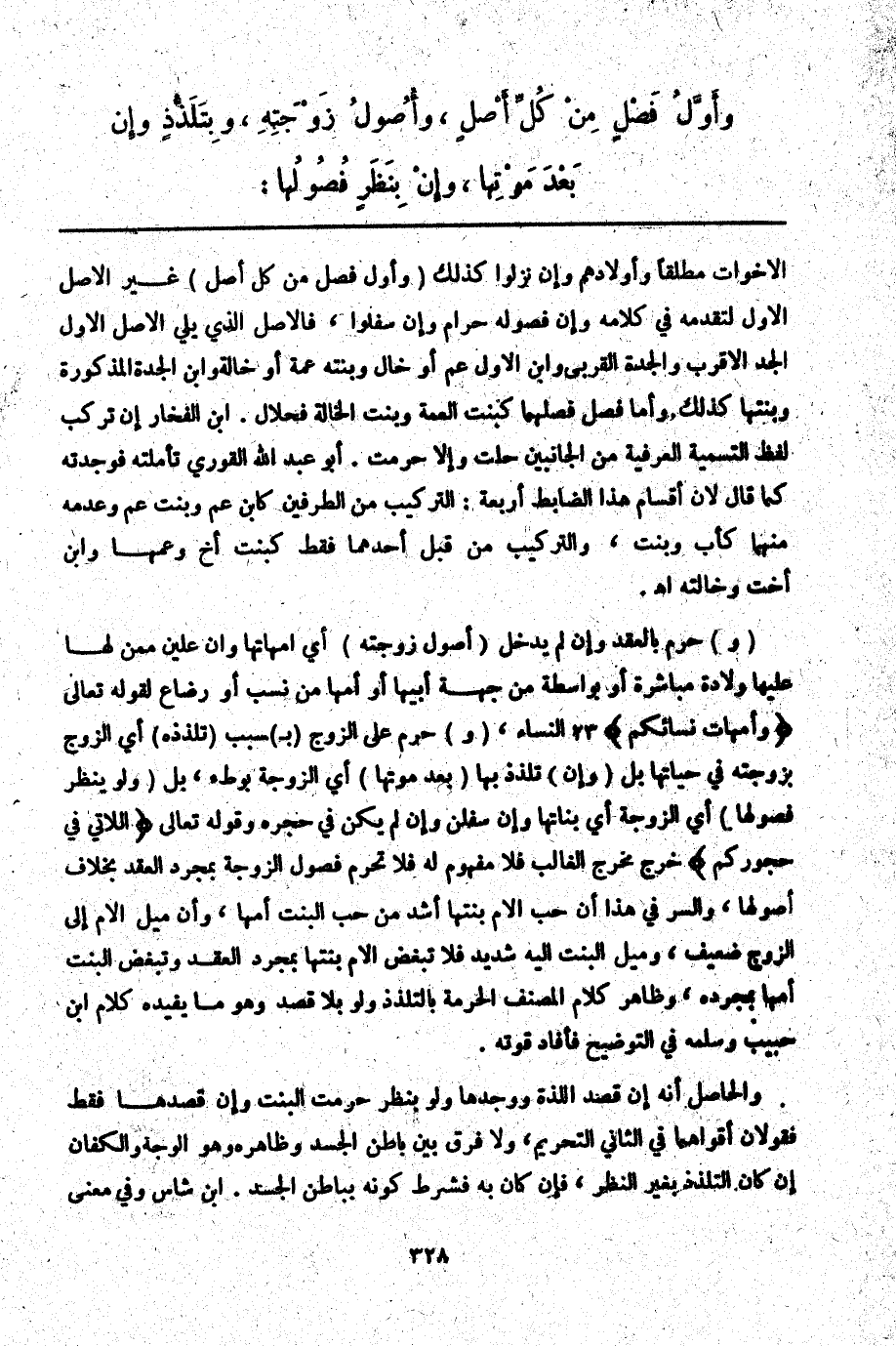ـــــــــــــــــــــــــــــQوَالْأَخَوَاتُ مُطْلَقًا وَأَوْلَادُهُمْ وَإِنْ نَزَلُوا كَذَلِكَ (وَأَوَّلُ فَصْلٍ مِنْ كُلِّ أَصْلٍ) غَيْرِ الْأَصْلِ الْأَوَّلِ لِتَقَدُّمِهِ فِي كَلَامِهِ وَإِنَّ فُصُولَهُ حَرَامٌ وَإِنْ سَفَلُوا، فَالْأَصْلُ الَّذِي يَلِي الْأَصْلَ الْأَوَّلَ الْجَدُّ الْأَقْرَبُ وَالْجَدَّةُ الْقُرْبَى وَابْنُ الْأَوَّلِ عَمٌّ أَوْ خَالٌ وَبِنْتُهُ عَمَّةٌ أَوْ خَالَةٌ وَابْنُ الْجَدَّةِ الْمَذْكُورَةِ وَبِنْتُهَا كَذَلِكَ. وَأَمَّا فَصْلُ فَصْلِهِمَا كَبِنْتِ الْعَمَّةِ وَبِنْتِ الْخَالَةِ فَحَلَالٌ. ابْنُ الْفَخَّارِ إنْ تَرَكَّبَ لَفْظُ التَّسْمِيَةِ الْعُرْفِيَّةِ مِنْ الْجَانِبَيْنِ حَلَّتْ وَإِلَّا حَرُمَتْ. أَبُو عَبْدِ اللَّهِ الْقُورِيُّ تَأَمَّلْته فَوَجَدْته كَمَا قَالَ لِأَنَّ أَقْسَامَ هَذَا الضَّابِطِ أَرْبَعَةٌ: التَّرْكِيبُ مِنْ الطَّرَفَيْنِ كَابْنِ عَمٍّ وَبِنْتِ عَمٍّ وَعَدَمُهُ مِنْهُمَا كَأَبٍ وَبِنْتٍ، وَالتَّرْكِيبُ مِنْ قِبَلِ أَحَدِهِمَا فَقَطْ كَبِنْتِ أَخٍ وَعَمِّهَا وَابْنِ أُخْتٍ وَخَالَتِهِ اهـ.