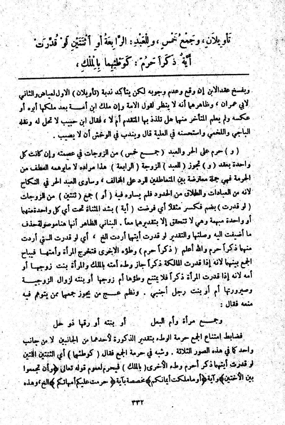 (وَ) حَرُمَ عَلَى الْحُرِّ وَالْعَبْدِ (جَمْعُ خَمْسٍ) مِنْ الزَّوْجَاتِ فِي عِصْمَتِهِ وَإِنْ كَانَتْ كُلُّ وَاحِدَةٍ بِعَقْدٍ (وَ) تَجُوزُ (لِلْعَبْدِ) الزَّوْجَةُ (الرَّابِعَةُ) هَذَا مُرَادُهُ لَا مَا يُوهِمُهُ الْعَطْفُ مِنْ الْحُرْمَةِ فَهِيَ جُمْلَةٌ مُعْتَرِضَةٌ بَيْنَ الْمُتَعَاطِفَيْنِ لِلرَّدِّ عَلَى الْمُخَالِفِ، وَسَاوَى الْعَبْدُ الْحُرَّ فِي النِّكَاحِ لِأَنَّهُ مِنْ الْعِبَادَاتِ وَالطَّلَاقُ مِنْ الْحُدُودِ فَلَمْ يُسَاوِهْ فِيهِ (أَوْ) جَمْعُ (ثِنْتَيْنِ) مِنْ الزَّوْجَاتِ (لَوْ قُدِّرَتْ) بِضَمٍّ فَكَسْرٍ مُثَقَّلًا أَيْ فُرِضَتْ (أَيَّةٌ) بِشَدِّ الْمُثَنَّاةِ تَحْتُ أَيْ كُلُّ وَاحِدَةٍ مِنْهُمَا أَوْ وَاحِدَةٌ مُبْهَمَةٌ وَهِيَ لَا تَتَحَقَّقُ إلَّا بِتَقْدِيرِهِمَا مَعًا. الْبُنَانِيُّ الظَّاهِرُ أَنَّهَا هُنَا مَوْصُولَةٌ حُذِفَ مَا أُضِيفَتْ إلَيْهِ وَصِلَتُهَا وَالتَّقْدِيرُ لَوْ قُدِّرَتْ أَيَّتُهُمَا أَرَدْت إلَخْ، أَيْ لَوْ قُدِّرَتْ الَّتِي أَرَدْت مِنْهُمَا ذَكَرًا حَرُمَ وَاَللَّهُ أَعْلَمُ (ذَكَرًا حَرُمَ) وَطْؤُهُ الْأُخْرَى فَتَخْرُجُ الْمَرْأَةُ وَأَمَتُهَا فَيُبَاحُ الْجَمْعُ بَيْنَهُمَا لِأَنَّهُ إذَا قُدِّرَتْ الْمَالِكَةُ ذَكَرًا جَازَ وَطْءُ أَمَتِهِ بِالْمِلْكِ وَالْمَرْأَةُ بِنْتُ زَوْجِهَا أَوْ أُمُّهُ لِأَنَّهُ إذَا قُدِّرَتْ الْمَرْأَةُ ذَكَرًا فَلَا يُمْتَنَعُ وَطْؤُهَا أُمَّ زَوْجِهَا أَوْ بِنْتَهُ لِزَوَالِ الزَّوْجِيَّةِ وَصَيْرُورَتِهَا أُمَّ أَوْ بِنْتَ رَجُلٍ أَجْنَبِيٍّ. وَنَظَمَ عج مَنْ يَجُوزُ جَمْعُهُمَا مِمَّنْ يُتَوَهَّمُ فِيهِ مَنْعُهُ فَقَالَ: