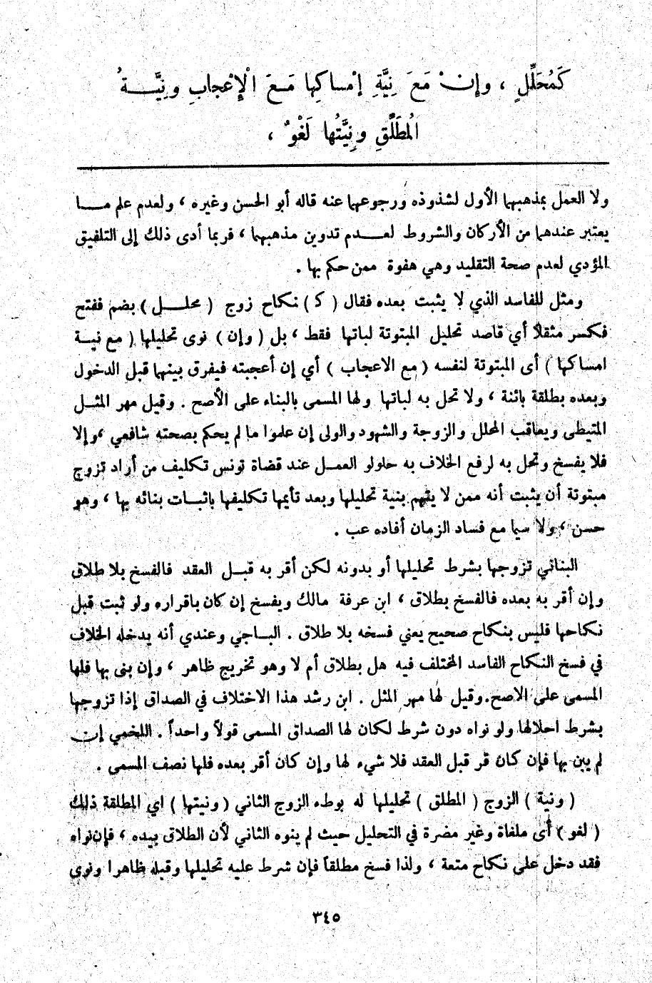 (وَنِيَّةُ) الزَّوْجِ (الْمُطَلِّقِ) تَحْلِيلُهَا لَهُ بِوَطْءِ الزَّوْجِ الثَّانِي (وَنِيَّتُهَا) أَيْ الْمُطَلَّقَةِ ذَلِكَ (لَغْوٌ) أَيْ مُلْغَاةٌ وَغَيْرُ مُضِرَّةٍ فِي التَّحْلِيلِ حَيْثُ لَمْ يَنْوِهِ الثَّانِي لِأَنَّ الطَّلَاقَ بِيَدِهِ، فَإِنْ نَوَاهُ فَقَدْ دَخَلَ عَلَى نِكَاحِ مُتْعَةٍ، وَلِذَا فُسِخَ مُطْلَقًا فَإِنْ شُرِطَ عَلَيْهِ تَحْلِيلُهَا وَقَبِلَهُ ظَاهِرًا وَنَوَى