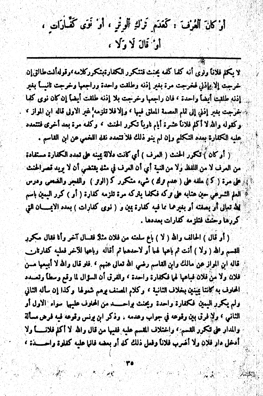 (أَوْ كَانَ) تَكَرُّرُ الْحِنْثِ (الْعُرْفَ) أَيْ كَانَتْ دَلَالَةُ يَمِينِهِ عَلَى تَعَدُّدِ الْكَفَّارَةِ مُسْتَفَادَةً مِنْ الْعُرْفِ لَا مِنْ اللَّفْظِ وَلَا مِنْ النِّيَّةِ أَيْ أَنَّ الْعُرْفَ فِي مِثْلِهِ يَقْتَضِي أَنْ لَا يُرِيدَ قَصْرَ الْحِنْثِ عَلَى مَرَّةٍ (كَ) عَلَّقَهُ عَلَى (عَدَمِ تَرْكِ) شَيْءٍ مُتَكَرِّرٍ كَ (الْوِتْرِ) وَالْفَجْرِ وَالضُّحَى وَدَرْسِ الْعِلْمِ الشَّرْعِيِّ حِينَ عِتَابِهِ عَلَى تَرْكِهِ فَكُلَّمَا يَتْرُكُهُ مَرَّةً تَلْزَمُهُ كَفَّارَةٌ (أَوْ) كَرَّرَ الْيَمِينَ بِاسْمِ اللَّهِ تَعَالَى أَوْ بِصِفَتِهِ أَوْ بِغَيْرِهِمَا مِمَّا فِيهِ كَفَّارَةُ يَمِينٍ وَ (نَوَى كَفَّارَاتٍ) بِعَدَدِ الْأَيْمَانِ الَّتِي كَرَّرَهَا وَحَنِثَ فَتَلْزَمُهُ كَفَّارَاتٌ بِعَدَدِهَا.