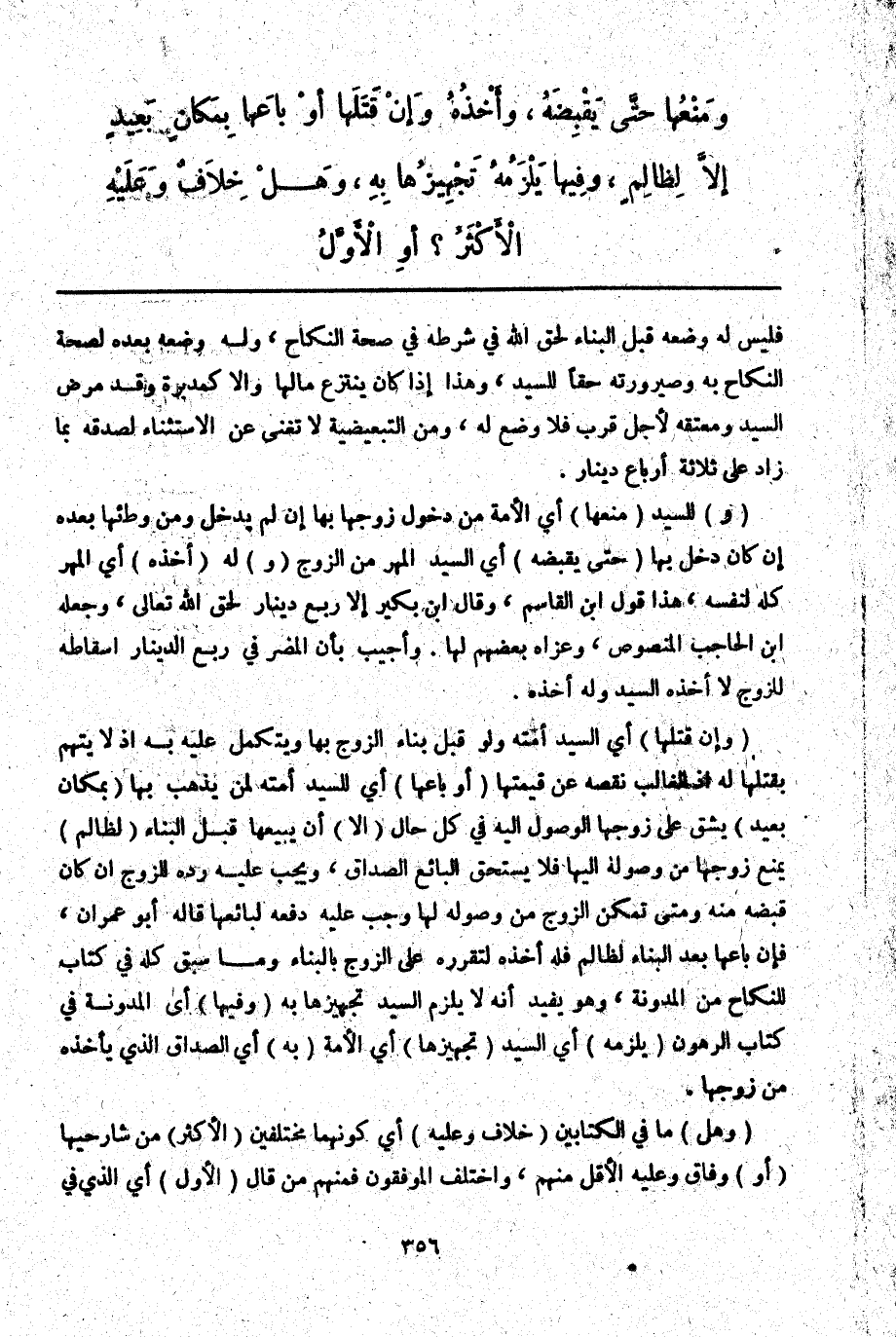 (وَ) لِلسَّيِّدِ (مَنْعُهَا) أَيْ الْأَمَةِ مِنْ دُخُولِ زَوْجِهَا بِهَا إنْ لَمْ يَدْخُلْ وَمِنْ وَطْئِهَا بَعْدَهُ إنْ كَانَ دَخَلَ بِهَا (حَتَّى يَقْبِضَهُ) أَيْ السَّيِّدُ الْمَهْرَ مِنْ الزَّوْجِ (وَ) لَهُ (أَخْذُهُ) أَيْ الْمَهْرِ كُلِّهِ لِنَفْسِهِ، هَذَا قَوْلُ ابْنِ الْقَاسِمِ، وَقَالَ ابْنُ بُكَيْر إلَّا رُبْعَ دِينَارٍ لِحَقِّ اللَّهِ تَعَالَى، وَجَعَلَهُ ابْنُ الْحَاجِبِ الْمَنْصُوصَ، وَعَزَاهُ بَعْضُهُمْ لَهَا. وَأُجِيبَ بِأَنَّ الْمُضِرَّ فِي رُبْعِ الدِّينَارِ إسْقَاطُهُ لِلزَّوْجِ لَا أَخْذُهُ السَّيِّدَ وَلَهُ أَخْذُهُ.
