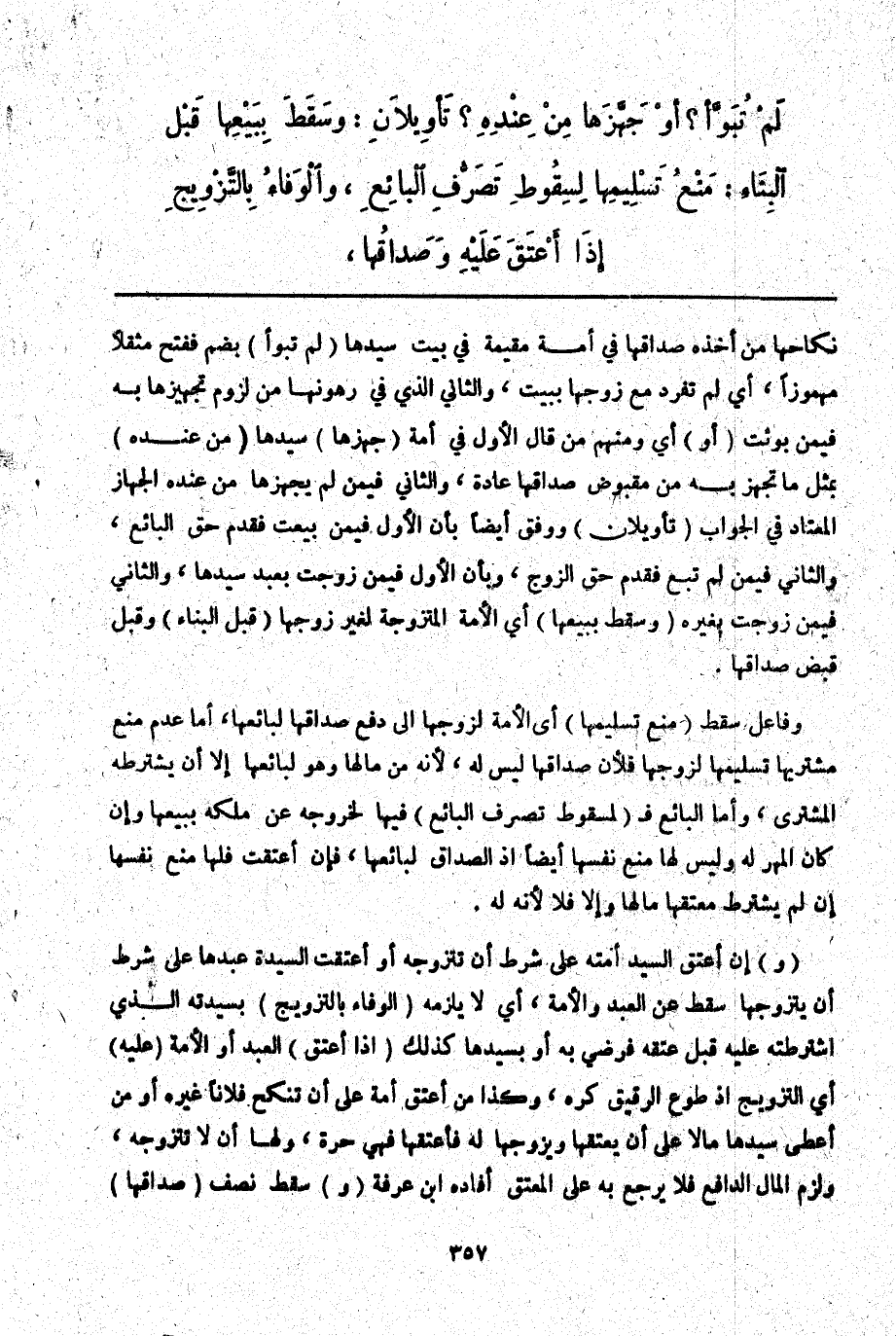 ـــــــــــــــــــــــــــــQنِكَاحِهَا مِنْ أَخْذِهِ صَدَاقَهَا فِي أَمَةٍ مُقِيمَةٍ فِي بَيْتِ سَيِّدِهَا (لَمْ تُبَوَّأْ) بِضَمٍّ فَفَتْحٍ مُثَقَّلًا مَهْمُوزًا، أَيْ لَمْ تُفْرَدْ مَعَ زَوْجِهَا بِبَيْتٍ، وَالثَّانِي الَّذِي فِي رُهُونِهَا مِنْ لُزُومِ تَجْهِيزِهَا بِهِ فِيمَنْ بُوِّئَتْ (أَوْ) أَيْ وَمِنْهُمْ مَنْ قَالَ الْأَوَّلُ فِي أَمَةٍ (جَهَّزَهَا) سَيِّدُهَا (مِنْ عِنْدِهِ) بِمِثْلِ مَا تُجَهَّزُ بِهِ مِنْ مَقْبُوضِ صَدَاقِهَا عَادَةً، وَالثَّانِي فِيمَنْ لَمْ يُجَهِّزْهَا مَنْ عِنْدَهُ الْجِهَازُ الْمُعْتَادُ فِي الْجَوَابِ (تَأْوِيلَانِ) وَوَفَّقَ أَيْضًا بِأَنَّ الْأَوَّلَ فِيمَنْ بِيعَتْ فَقُدِّمَ حَقُّ الْبَائِعِ، وَالثَّانِي فِيمَنْ لَمْ تُبَعْ فَقُدِّمَ حَقُّ الزَّوْجِ، وَبِأَنَّ الْأَوَّلَ فِيمَنْ زُوِّجَتْ بِعَبْدِ سَيِّدِهَا، وَالثَّانِي فِيمَنْ زُوِّجَتْ بِغَيْرِهِ (وَسَقَطَ بِبَيْعِهَا) أَيْ الْأَمَةِ الْمُتَزَوِّجَةِ لِغَيْرِ زَوْجِهَا (قَبْلَ الْبِنَاءِ) وَقَبْلَ قَبْضِ صَدَاقِهَا.