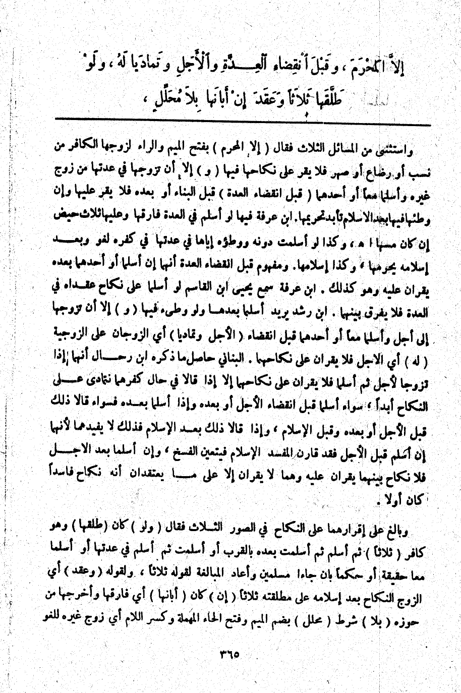 ـــــــــــــــــــــــــــــQوَاسْتَثْنَى مِنْ الْمَسَائِلِ الثَّلَاثِ فَقَالَ (إلَّا الْمَحْرَمَ) بِفَتْحِ الْمِيمِ وَالرَّاءِ لِزَوْجِهَا الْكَافِرِ مِنْ نَسَبٍ أَوْ رَضَاعٍ أَوْ صِهْرٍ فَلَا يُقَرُّ عَلَى نِكَاحِهَا فِيهَا (وَ) إلَّا إنْ تَزَوَّجَهَا فِي عِدَّتِهَا مِنْ زَوْجٍ غَيْرِهِ وَأَسْلَمَا مَعًا أَوْ أَحَدُهُمَا (قَبْلَ انْقِضَاءِ الْعِدَّةِ) قَبْلَ الْبِنَاءِ أَوْ بَعْدَهُ فَلَا يُقَرُّ عَلَيْهَا، وَإِنْ وَطِئَهَا فِيهَا بَعْدَ الْإِسْلَامِ تَأَبَّدَ تَحْرِيمُهَا. ابْنُ عَرَفَةَ فِيهَا لَوْ أَسْلَمَ فِي الْعِدَّةِ فَارَقَهَا وَعَلَيْهَا ثَلَاثُ حِيَضٍ إنْ كَانَ مَسَّهَا. اهـ. وَكَذَا لَوْ أَسْلَمَتْ دُونَهُ وَوَطْؤُهُ إيَّاهَا فِي عِدَّتِهَا فِي كُفْرِهِ لَغْوٌ وَبَعْدَ إسْلَامِهِ يُحَرِّمُهَا، وَكَذَا إسْلَامُهَا. وَمَفْهُومُ قَبْلَ انْقِضَاءِ الْعِدَّةِ أَنَّهُمَا إنْ أَسْلَمَا أَوْ أَحَدُهُمَا بَعْدَهُ يُقَرَّانِ عَلَيْهِ وَهُوَ كَذَلِكَ. ابْنُ عَرَفَةَ سَمِعَ يَحْيَى بْنَ الْقَاسِمِ لَوْ أَسْلَمَا عَلَى نِكَاحٍ عَقَدَاهُ فِي الْعِدَّةِ فَلَا يُفَرَّقُ بَيْنَهُمَا. ابْنُ رُشْدٍ يُرِيدُ أَسْلَمَا بَعْدَهَا وَلَوْ وَطِئَ فِيهَا (وَ) إلَّا إنْ تَزَوَّجَهَا إلَى أَجَلٍ وَأَسْلَمَا مَعًا أَوْ أَحَدُهُمَا قَبْلَ انْقِضَاءِ (الْأَجَلِ وَتَمَادَيَا) أَيْ الزَّوْجَانِ عَلَى الزَّوْجِيَّةِ (لَهُ) أَيْ الْأَجَلِ فَلَا يُقَرَّانِ عَلَى نِكَاحِهِمَا. الْبُنَانِيُّ حَاصِلُ مَا ذَكَرَهُ ابْنُ رَحَّالٍ أَنَّهُمَا إذَا تَزَوَّجَا لِأَجَلٍ ثُمَّ أَسْلَمَا فَلَا يُقَرَّانِ عَلَى نِكَاحِهِمَا إلَّا إذَا قَالَا فِي حَالِ كُفْرِهِمَا نَتَمَادَى عَلَى النِّكَاحِ أَبَدًا، سَوَاءٌ أَسْلَمَا قَبْلَ انْقِضَاءِ الْأَجَلِ أَوْ بَعْدَهُ وَإِذَا أَسْلَمَا بَعْدَهُ فَسَوَاءٌ قَالَا ذَلِكَ قَبْلَ الْأَجَلِ أَوْ بَعْدَهُ وَقَبْلَ الْإِسْلَامِ، وَإِذَا قَالَا ذَلِكَ بَعْدَ الْإِسْلَامِ فَذَلِكَ لَا يُفِيدُهُمَا لِأَنَّهُمَا إنْ أَسْلَمَا قَبْلَ الْأَجَلِ فَقَدْ قَارَنَ الْمُفْسِدَ الْإِسْلَامُ فَيَتَعَيَّنُ الْفَسْخُ، وَإِنْ أَسْلَمَا بَعْدَ الْأَجَلِ فَلَا نِكَاحَ بَيْنَهُمَا يُقَرَّانِ عَلَيْهِ وَهُمَا لَا يُقَرَّانِ إلَّا عَلَى مَا يَعْتَقِدَانِ أَنَّهُ نِكَاحٌ فَاسِدًا كَانَ أَوْ لَا.