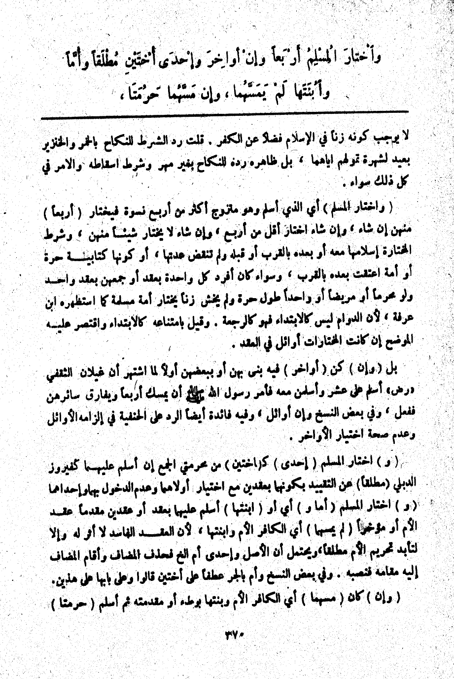 (وَاخْتَارَ الْمُسْلِمُ) أَيْ الَّذِي أَسْلَمَ وَهُوَ مُتَزَوِّجٌ أَكْثَرَ مِنْ أَرْبَعِ نِسْوَةٍ فَيَخْتَارُ (أَرْبَعًا) مِنْهُنَّ إنْ شَاءَ، وَإِنْ شَاءَ اخْتَارَ أَقَلَّ مِنْ أَرْبَعٍ، وَإِنْ شَاءَ لَا يَخْتَارُ شَيْئًا مِنْهُنَّ، وَشَرْطُ الْمُخْتَارَةِ إسْلَامُهَا مَعَهُ أَوْ بَعْدَهُ بِالْقُرْبِ أَوْ قَبْلَهُ وَلَمْ تَنْقَضِ عِدَّتُهَا، أَوْ كَوْنُهَا كِتَابِيَّةً حُرَّةً أَوْ أَمَةً أُعْتِقَتْ بَعْدَهُ بِالْقُرْبِ، وَسَوَاءٌ كَانَ أَفْرَدَ كُلَّ وَاحِدَةٍ بِعَقْدٍ أَوْ جَمَعَهُنَّ بِعَقْدٍ وَاحِدٍ وَلَوْ مُحْرِمًا أَوْ مَرِيضًا أَوْ وَاجِدًا طَوْلَ حُرَّةٍ وَلَمْ يَخْشَ زِنًا يَخْتَارُ أَمَةً مُسْلِمَةً كَمَا اسْتَظْهَرَهُ ابْنُ عَرَفَةَ، لِأَنَّ الدَّوَامَ لَيْسَ كَالِابْتِدَاءِ فَهُوَ كَالرَّجْعَةِ. وَقِيلَ بِامْتِنَاعِهِ كَالِابْتِدَاءِ وَاقْتَصَرَ عَلَيْهِ الْمُوَضِّحُ إنْ كَانَتْ الْمُخْتَارَاتُ أَوَائِلَ فِي الْعَقْدِ.