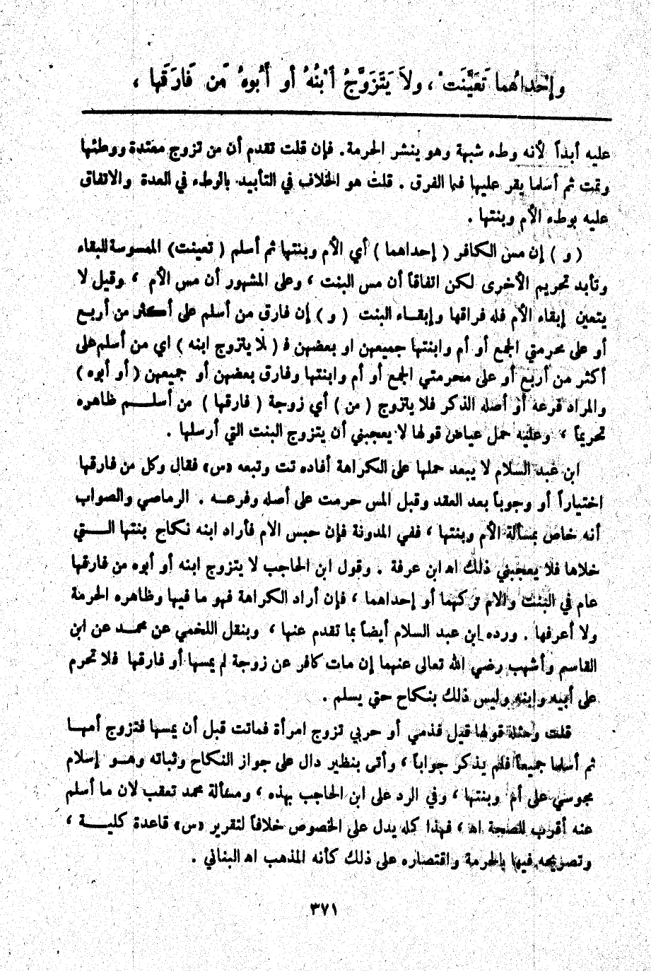 ابْنُ عَبْدِ السَّلَامِ لَا يَبْعُدُ حَمْلُهَا عَلَى الْكَرَاهَةِ أَفَادَهُ تت وَتَبِعَهُ " س " فَقَالَ وَكُلُّ مَنْ فَارَقَهَا اخْتِيَارًا أَوْ وُجُوبًا بَعْدَ الْعَقْدِ وَقَبْلَ الْمَسِّ حَرُمَتْ عَلَى أَصْلِهِ وَفَرْعِهِ. الرَّمَاصِيُّ وَالصَّوَابُ أَنَّهُ خَاصٌّ بِمَسْأَلَةِ الْأُمِّ وَبِنْتِهَا، فَفِي الْمُدَوَّنَةِ فَإِنْ حَبَسَ الْأُمَّ فَأَرَادَ ابْنُهُ نِكَاحَ بِنْتِهَا الَّتِي خَلَاهَا فَلَا يُعْجِبُنِي ذَلِكَ اهـ ابْنُ عَرَفَةَ. وَقَوْلُ ابْنِ الْحَاجِبِ لَا يَتَزَوَّجُ ابْنُهُ أَوْ أَبُوهُ مَنْ فَارَقَهَا عَامٌّ فِي الْبِنْتِ وَالْأُمِّ تَرَكَهُمَا أَوْ إحْدَاهُمَا، فَإِنْ أَرَادَ الْكَرَاهَةَ فَهُوَ مَا فِيهَا وَظَاهِرُهُ الْحُرْمَةُ وَلَا أَعْرِفُهَا. وَرَدَّهُ ابْنُ عَبْدِ السَّلَامِ أَيْضًا بِمَا تَقَدَّمَ عَنْهَا، وَبِنَقْلِ اللَّخْمِيِّ عَنْ مُحَمَّدٍ عَنْ ابْنِ الْقَاسِمِ وَأَشْهَبَ - رَضِيَ اللَّهُ تَعَالَى عَنْهُمَا - إنْ مَاتَ كَافِرٌ عَنْ زَوْجَةٍ لَمْ يَمَسَّهَا أَوْ فَارَقَهَا فَلَا تَحْرُمُ عَلَى أَبِيهِ وَابْنِهِ وَلَيْسَ ذَلِكَ بِنِكَاحٍ حَتَّى يُسْلِمَ.