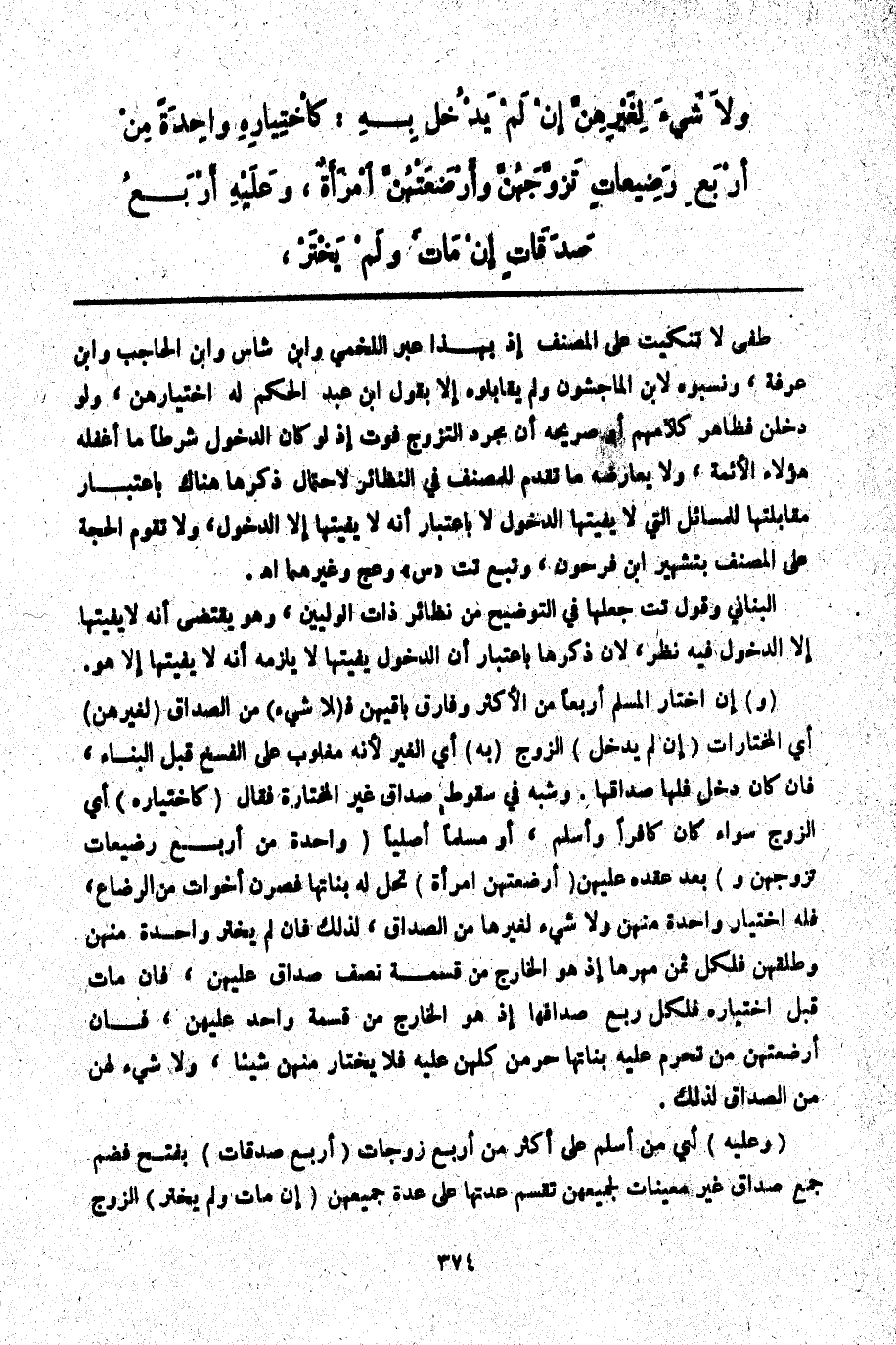 (وَعَلَيْهِ) أَيْ مَنْ أَسْلَمَ عَلَى أَكْثَرَ مِنْ أَرْبَعِ زَوْجَاتٍ (أَرْبَعُ صَدُقَاتٍ) بِفَتْحٍ فَضَمٍّ جَمْعُ صَدَاقٍ غَيْرُ مُعَيَّنَاتٍ لِجَمِيعِهِنَّ تُقْسَمُ عِدَّتُهَا عَلَى عِدَّةِ جَمِيعِهِنَّ (إنْ مَاتَ وَلَمْ يَخْتَرْ) الزَّوْجُ