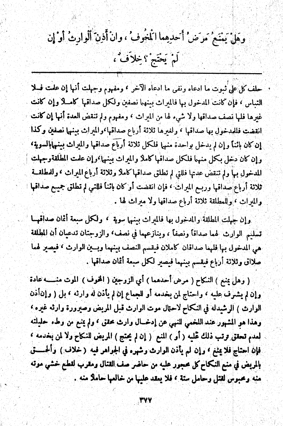 (وَهَلْ يَمْنَعُ) النِّكَاحَ (مَرَضُ أَحَدِهِمَا) أَيْ الزَّوْجَيْنِ (الْمَخُوفُ) الْمَوْتُ مِنْهُ عَادَةً وَإِنْ لَمْ يُشْرِفْ عَلَيْهِ، وَاحْتَاجَ لِمَنْ يَخْدُمُهُ أَوْ لِلْجِمَاعِ إنْ لَمْ يَأْذَنْ لَهُ وَارِثُهُ، بَلْ (وَإِنْ أَذِنَ الْوَارِثُ) الرَّشِيدُ لَهُ فِي النِّكَاحِ لِاحْتِمَالِ مَوْتِ الْوَارِثِ قَبْلَ الْمَرِيضِ وَصَيْرُورَةِ وَارِثِهِ غَيْرَهُ، وَهَذَا هُوَ الْمَشْهُورُ عِنْدَ اللَّخْمِيِّ لِلنَّهْيِ عَنْ إدْخَالِ وَارِثٍ مُحَقَّقٍ، وَلَمْ يُمْنَعْ مِنْ وَطْءِ حَلِيلَتِهِ لِعَدَمِ تَحَقُّقِ تَرَتُّبِ ذَلِكَ عَلَيْهِ (أَوْ) الْمَنْعُ (إنْ لَمْ يَحْتَجْ) الْمَرِيضُ لِلنِّكَاحِ وَلَا لِمَنْ يَخْدُمُهُ، فَإِنْ احْتَاجَ فَلَا يُمْنَعُ، وَإِنْ لَمْ يَأْذَنْ الْوَارِثُ وَشَهَرَهُ فِي الْجَوَاهِرِ فِيهِ (خِلَافٌ) وَأُلْحِقَ بِالْمَرِيضِ فِي مَنْعِ النِّكَاحِ كُلُّ مَحْجُورٍ عَلَيْهِ مِنْ حَاضِرِ صَفِّ الْقِتَالِ وَمُقَرَّبٍ لِقَطْعٍ خُشِيَ مَوْتُهُ مِنْهُ وَمَحْبُوسٍ لِقَتْلٍ وَحَامِلٍ سِتَّةً، فَلَا يَعْقِدُ عَلَيْهَا مَنْ خَالَعَهَا حَامِلًا مِنْهُ.