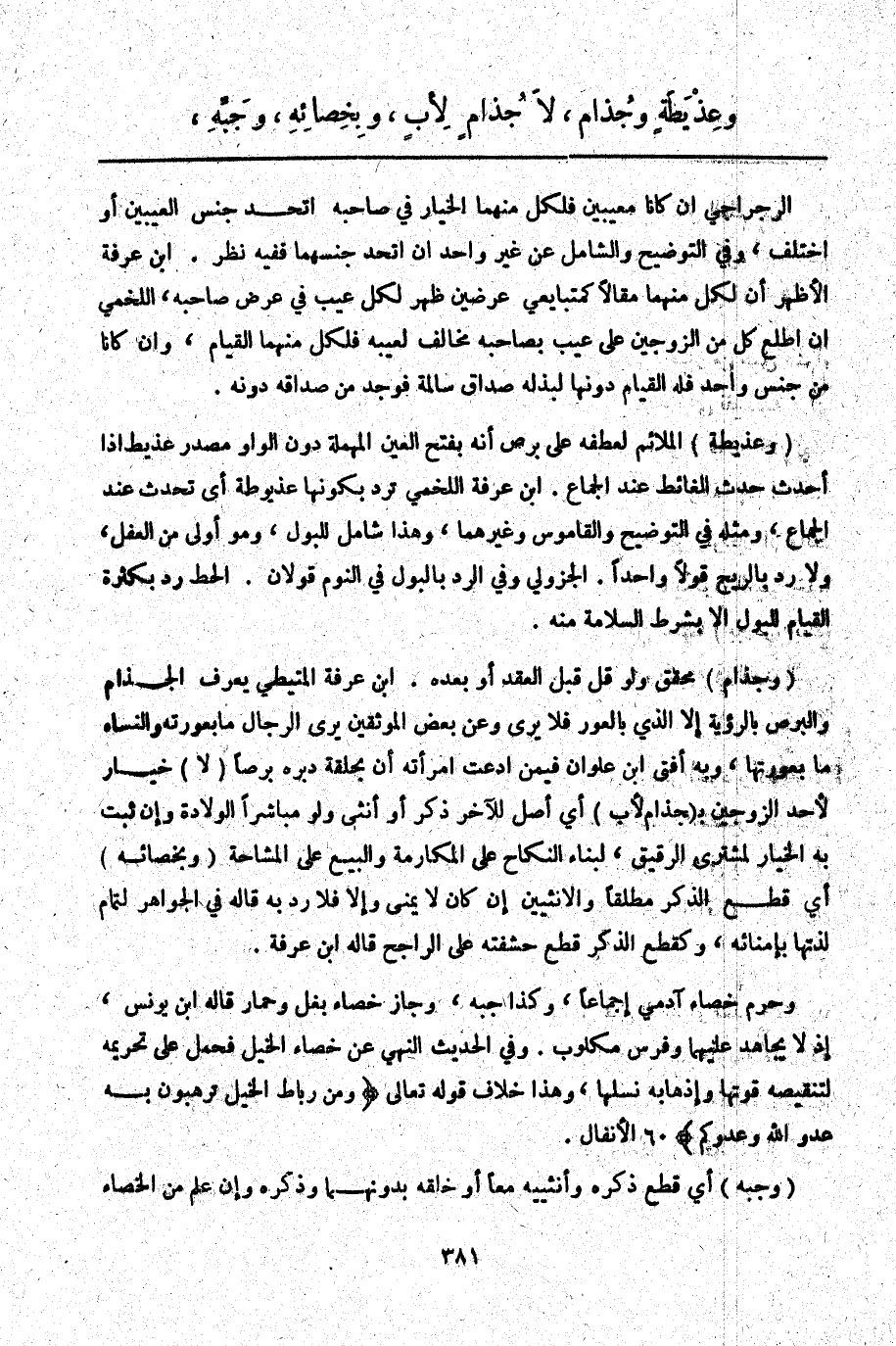 (وَعَذْيَطَةٍ) الْمُلَائِمُ لِعَطْفِهِ عَلَى بَرَصٍ أَنَّهُ بِفَتْحِ الْعَيْنِ الْمُهْمَلَةِ دُونَ الْوَاوِ مَصْدَرُ عَذْيَطَ إذَا أَحْدَثَ حَدَثَ الْغَائِطِ عِنْدَ الْجِمَاعِ. ابْنُ عَرَفَةَ اللَّخْمِيُّ تُرَدُّ بِكَوْنِهَا عِذْيَوْطَةً أَيْ تُحْدِثُ عِنْدَ الْجِمَاعِ، وَمِثْلُهُ فِي التَّوْضِيحِ وَالْقَامُوسِ وَغَيْرِهِمَا، وَهَذَا شَامِلٌ لِلْبَوْلِ، وَهُوَ أَوْلَى مِنْ الْعَفَلِ، وَلَا رَدَّ بِالرِّيحِ قَوْلًا وَاحِدًا. الْجُزُولِيُّ وَفِي الرَّدِّ بِالْبَوْلِ فِي النَّوْمِ قَوْلَانِ. الْحَطُّ رَدٌّ بِكَثْرَةِ الْقِيَامِ لِلْبَوْلِ إلَّا بِشَرْطِ السَّلَامَةِ مِنْهُ.