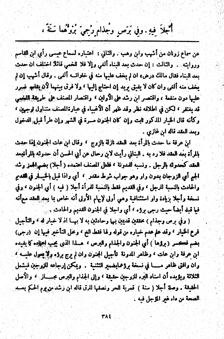 ابْنُ عَرَفَةَ مَا حَدَثَ بِالْمَرْأَةِ بَعْدَ الْعَقْدِ نَازِلَةٌ بِالزَّوْجِ، وَقَالَ ابْنُ عَاتٍ الْجُنُونُ إذَا حَدَثَ بِالْمَرْأَةِ بَعْدَ الْعَقْدِ فَلَا رَدَّ بِهِ. الْبُنَانِيُّ رَأَيْت لِابْنِ رَحَّالٍ عَنْ أَبِي الْحَسَنِ أَنَّ حُدُوثَهُ بِالْمَرْأَةِ بَعْدَ الْعَقْدِ كَحُدُوثِهِ بِالرَّجُلِ. وَنَسَبَهُ لِلْمُدَوَّنَةِ، فَلَعَلَّ الْمُصَنِّفَ اعْتَمَدَهُ (أُجِّلَا) بِضَمِّ الْهَمْزِ وَشَدِّ الْجِيمِ أَيْ الزَّوْجَانِ بِدُونِ وَاوٍ وَهُوَ جَوَابُ شَرْطٍ مُقَدَّرٍ، أَيْ وَإِذَا قِيلَ بِالْخِيَارِ فِي الْقَدِيمِ وَالْحَادِثِ بِالنِّسْبَةِ لِلرَّجُلِ، وَفِي الْقَدِيمِ فَقَطْ بِالنِّسْبَةِ لِلْمَرْأَةِ أُجِّلَا (فِيهِ) أَيْ الْجُنُونِ، وَفِي نُسْخَةٍ وَأُجِّلَا بِزِيَادَةِ وَاوٍ اسْتِئْنَافِيَّةٍ وَهِيَ أَوْلَى لِإِيهَامِ الْأُولَى أَنَّهُ خَاصٌّ بِمَا بَعْدَ الْعَقْدِ مَعَ أَنَّهُ فِيمَا قَبْلَهُ أَيْضًا حَيْثُ رُجِيَ بُرْؤُهُ، أَيْ وَأُجِّلَا فِي الْجُنُونِ الْقَدِيمِ وَالْحَادِثِ.