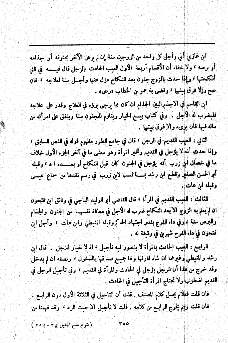 الثَّانِي: الْعَيْبُ الْقَدِيمُ فِي الرَّجُلِ، قَالَ فِي جَامِعِ الطُّرَرِ مَفْهُومُ قَوْلِهِ فِي النَّصِّ السَّابِقِ، وَإِذَا حَدَثَ أَنَّهُ لَا يُؤَجَّلُ فِي الْقَدِيمِ وَتُخَيَّرُ الْمَرْأَةُ وَهُوَ مَعْنَى مَا فِي آخِرِ الْجُزْءِ فِي الْأَوَّلِ خِلَافُ مَا فِي خِصَالِ ابْنِ زَرْبٍ أَنَّهُ يُؤَجَّلُ فِي الْجُنُونِ كَانَ قَبْلَ النِّكَاحِ أَوْ بَعْدَهُ. اهـ. وَقَبِلَهُ أَبُو الْحَسَنِ الصَّغِيرُ وَقَطَعَ ابْنُ رُشْدٍ بِمَا نَسَبَ لِابْنِ زَرِبٍ فِي رَسْمِ نَقَدَهَا مِنْ سَمَاعِ عِيسَى وَقَبِلَهُ ابْنُ عَاتٍ.