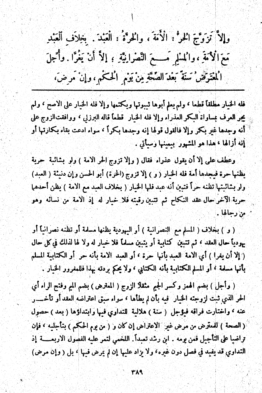 (وَأُجِّلَ) بِضَمِّ الْهَمْزِ وَكَسْرِ الْجِيمِ مُثَقَّلًا الزَّوْجُ (الْمُعْتَرَضُ) بِضَمِّ الْمِيمِ وَفَتْحِ الرَّاءِ أَيْ الْحُرُّ الَّذِي ثَبَتَ لِزَوْجَتِهِ الْخِيَارُ فِيهِ بِأَنْ لَمْ يَطَأْهَا، سَوَاءٌ سَبَقَ اعْتِرَاضُهُ الْعَقْدَ أَوْ تَأَخَّرَ عَنْهُ، وَاخْتَارَتْ فِرَاقَهُ فَيُؤَجَّلُ (سَنَةً) هِلَالِيَّةً لِلتَّدَاوِي فِيهَا وَابْتِدَاؤُهَا (بَعْدَ) حُصُولِ (الصِّحَّةِ) لِلْمُعْتَرَضِ مِنْ مَرَضٍ غَيْرِ الِاعْتِرَاضِ إنْ كَانَ وَ (مِنْ يَوْمِ الْحُكْمِ) بِتَأْجِيلِهِ، فَإِنْ تَرَاضَيَا عَلَى التَّأْجِيلِ فَمِنْ يَوْمِهِ. ابْنُ رُشْدٍ تَعَبُّدًا. اللَّخْمِيُّ لِتَمُرَّ عَلَيْهِ الْفُصُولُ الْأَرْبَعَةُ إذْ التَّدَاوِي قَدْ يُفِيدُ فِي فَصْلٍ دُونَ غَيْرِهِ، وَلَا يُزَادُ عَلَيْهَا إنْ لَمْ يَمْرَضْ فِيهَا، بَلْ (وَإِنْ مَرِضَ)