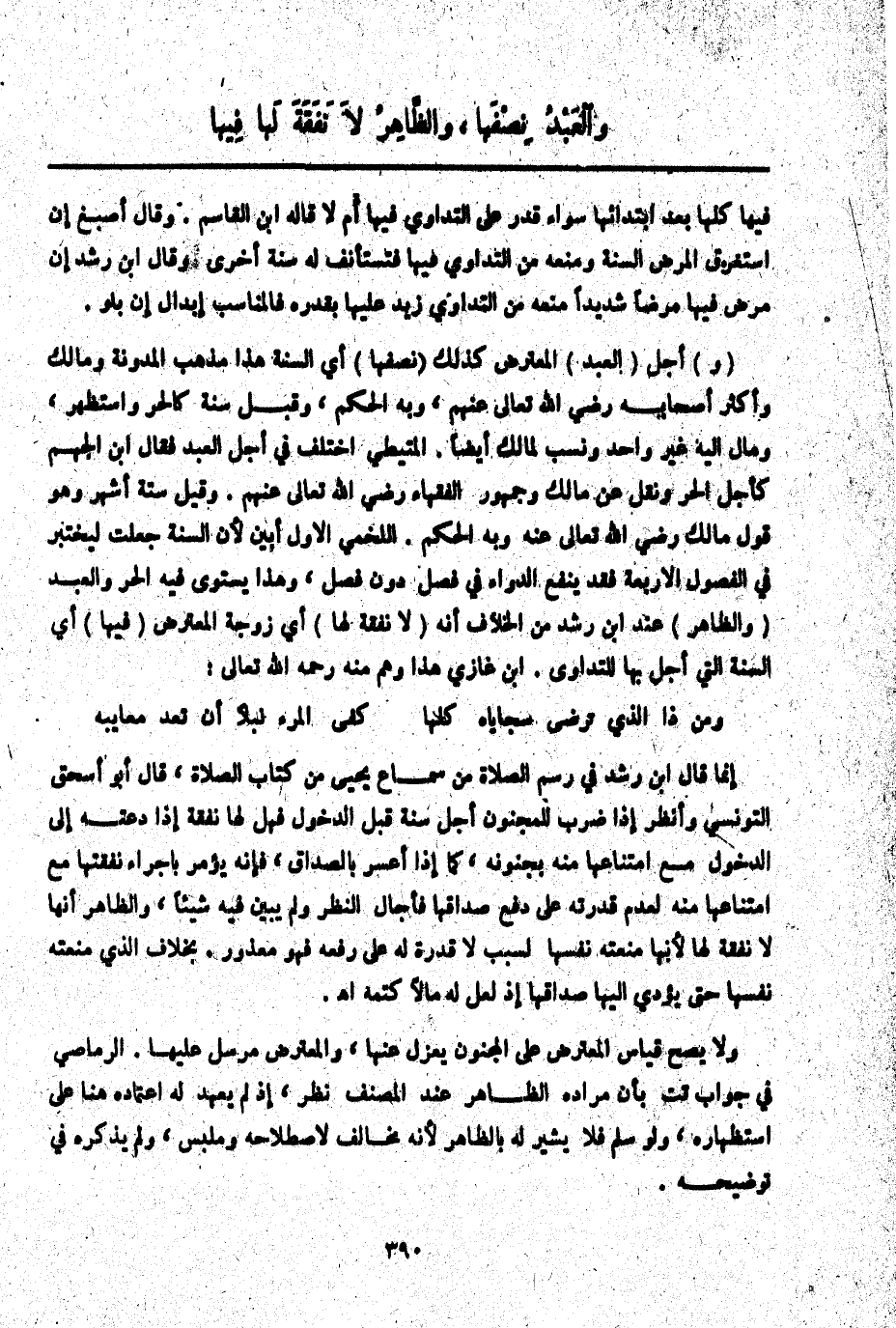 (وَ) أُجِّلَ (الْعَبْدُ) الْمُعْتَرَضُ كَذَلِكَ (نِصْفَهَا) أَيْ السَّنَةِ هَذَا مَذْهَبُ الْمُدَوَّنَةِ وَمَالِكٍ وَأَكْثَرِ أَصْحَابِهِ - رَضِيَ اللَّهُ تَعَالَى عَنْهُمْ - وَبِهِ الْحُكْمُ، وَقِيلَ سَنَةً كَالْحُرِّ وَاسْتُظْهِرَ، وَمَالَ إلَيْهِ غَيْرُ وَاحِدٍ وَنُسِبَ لِمَالِكٍ أَيْضًا. الْمُتَيْطِيُّ اُخْتُلِفَ فِي أَجَلِ الْعَبْدِ فَقَالَ ابْنُ الْجَهْمِ كَأَجَلِ الْحُرِّ وَنُقِلَ عَنْ مَالِكٍ وَجُمْهُورِ الْفُقَهَاءِ - رَضِيَ اللَّهُ تَعَالَى عَنْهُمْ -. وَقِيلَ سِتَّةُ أَشْهُرٍ وَهُوَ قَوْلُ مَالِكٍ - رَضِيَ اللَّهُ تَعَالَى عَنْهُ - وَبِهِ الْحُكْمُ. اللَّخْمِيُّ الْأَوَّلُ أَبْيَنُ لِأَنَّ السَّنَةَ جُعِلَتْ لِيُخْتَبَرَ فِي الْفُصُولِ الْأَرْبَعَةِ فَقَدْ يَنْفَعُ الدَّوَاءُ فِي فَصْلٍ دُونَ فَصْلٍ، وَهَذَا يَسْتَوِي فِيهِ الْحُرُّ وَالْعَبْدُ (وَالظَّاهِرُ) عِنْدَ ابْنِ رُشْدٍ مِنْ الْخِلَافِ أَنَّهُ (لَا نَفَقَةَ لَهَا) أَيْ زَوْجَةِ الْمُعْتَرَضِ (فِيهَا) أَيْ السَّنَةِ الَّتِي أُجِّلَ بِهَا لِلتَّدَاوِي. ابْنُ غَازِيٍّ هَذَا وَهْمٌ مِنْهُ - رَحِمَهُ اللَّهُ تَعَالَى -: