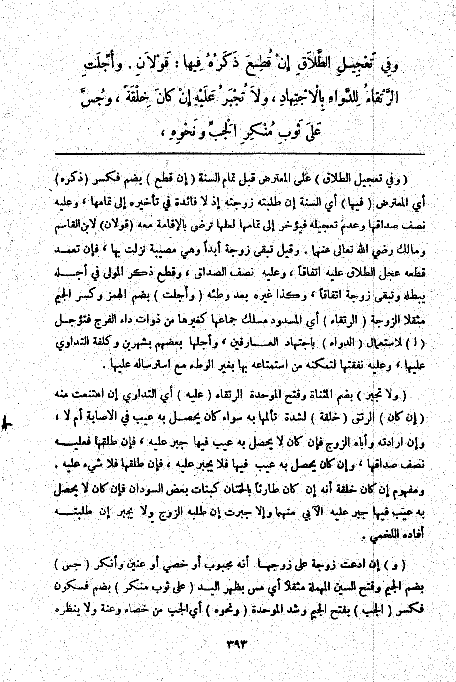 ـــــــــــــــــــــــــــــQ (وَفِي تَعْجِيلِ الطَّلَاقِ) عَلَى الْمُعْتَرَضِ قَبْلَ تَمَامِ السَّنَةِ (إنْ قُطِعَ) بِضَمٍّ فَكَسْرٍ (ذَكَرُهُ) أَيْ الْمُعْتَرَضِ (فِيهَا) أَيْ السَّنَةِ إنْ طَلَبَتْهُ زَوْجَتُهُ إذْ لَا فَائِدَةَ فِي تَأْخِيرِهِ إلَى تَمَامِهَا، وَعَلَيْهِ نِصْفُ صَدَاقِهَا وَعَدَمُ تَعْجِيلِهِ فَيُؤَخَّرُ إلَى تَمَامِهَا لَعَلَّهَا تَرْضَى بِالْإِقَامَةِ مَعَهُ (قَوْلَانِ) لِابْنِ الْقَاسِمِ وَمَالِكٍ - رَضِيَ اللَّهُ تَعَالَى عَنْهُمَا -. وَقِيلَ تَبْقَى زَوْجَةً أَبَدًا وَهِيَ مُصِيبَةٌ نَزَلَتْ بِهَا، فَإِنْ تَعَمَّدَ قَطْعَهُ عُجِّلَ الطَّلَاقُ عَلَيْهِ اتِّفَاقًا، وَعَلَيْهِ نِصْفُ الصَّدَاقِ، وَقَطْعُ ذَكَرِ الْمَوْلَى فِي أَجَلِهِ يُبْطِلُهُ وَتَبْقَى زَوْجَةً اتِّفَاقًا، وَكَذَا غَيْرُهُ بَعْدَ وَطْئِهِ (وَأُجِّلَتْ) بِضَمِّ الْهَمْزِ وَكَسْرِ الْجِيمِ مُثَقَّلًا الزَّوْجَةُ (الرَّتْقَاءُ) أَيْ الْمَسْدُودُ مَسْلَكُ جِمَاعِهَا كَغَيْرِهَا مِنْ ذَوَاتِ دَاءِ الْفَرْجِ فَتُؤَجَّلُ (لِ) لِاسْتِعْمَالِ (الدَّوَاءِ) بِاجْتِهَادِ الْعَارِفِينَ، وَأَجَّلَهَا بَعْضُهُمْ بِشَهْرَيْنِ وَكُلْفَةُ التَّدَاوِي عَلَيْهَا، وَعَلَيْهِ نَفَقَتُهَا لِتَمَكُّنِهِ مِنْ اسْتِمْتَاعِهِ بِهَا بِغَيْرِ الْوَطْءِ مَعَ اسْتِرْسَالِهِ عَلَيْهَا.