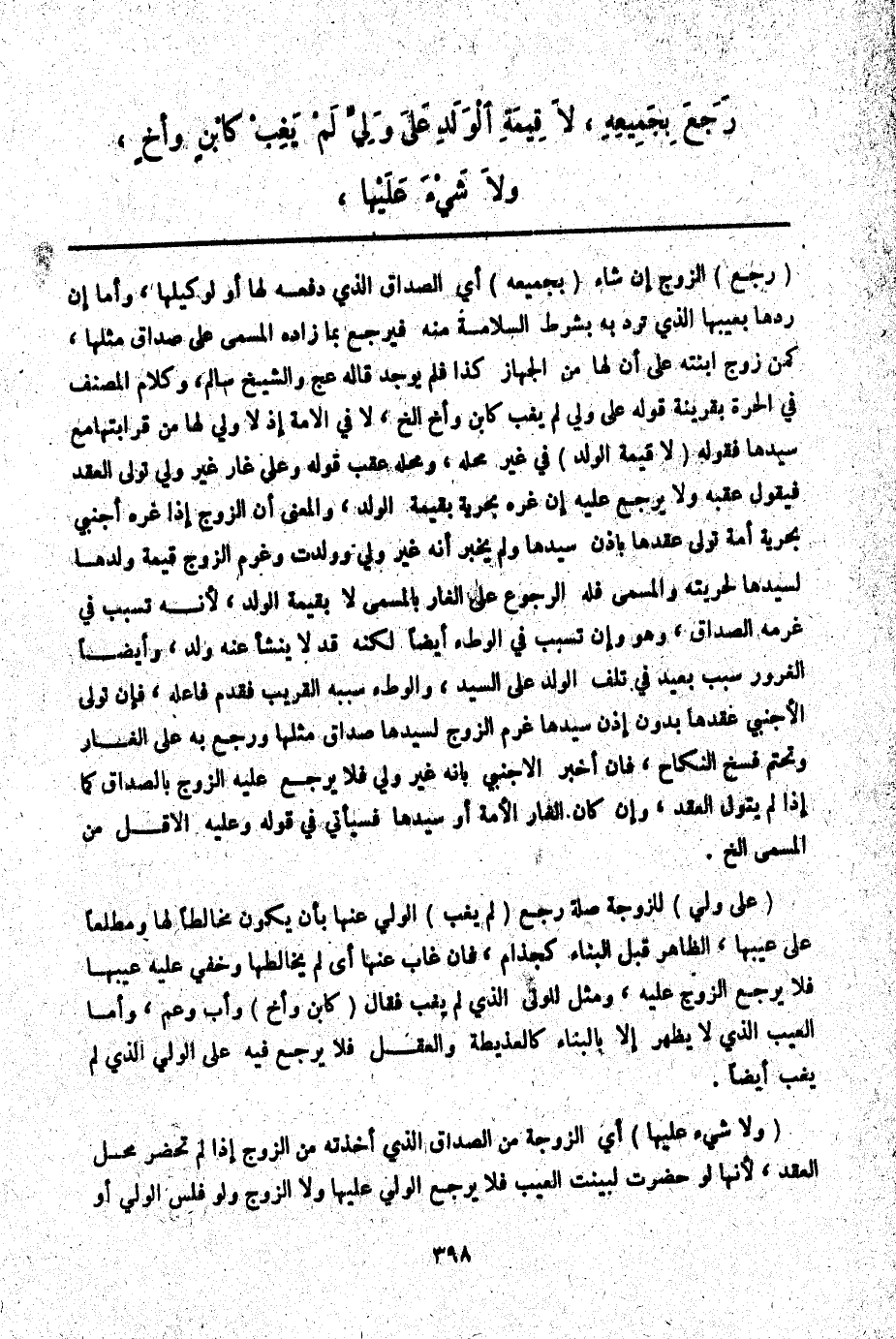 ـــــــــــــــــــــــــــــQرَجَعَ) الزَّوْجُ إنْ شَاءَ (بِجَمِيعِهِ) أَيْ الصَّدَاقِ الَّذِي دَفَعَهُ لَهَا أَوْ لِوَكِيلِهَا، وَأَمَّا إنْ رَدَّهَا بِعَيْبِهَا الَّذِي تُرَدُّ بِهِ بِشَرْطِ السَّلَامَةِ مِنْهُ فَيَرْجِعُ بِمَا زَادَهُ الْمُسَمَّى عَلَى صَدَاقِ مِثْلِهَا، كَمَنْ زَوَّجَ ابْنَتَهُ عَلَى أَنَّ لَهَا مِنْ الْجِهَازِ كَذَا فَلَمْ يُوجَدْ قَالَهُ عج وَالشَّيْخُ سَالِمٌ، وَكَلَامُ الْمُصَنِّفِ فِي الْحُرَّةِ بِقَرِينَةِ قَوْلِهِ عَلَى وَلِيٍّ لَمْ يَغِبْ كَابْنٍ وَأَخٍ إلَخْ، لَا فِي الْأَمَةِ إذْ لَا وَلِيَّ لَهَا مِنْ قَرَابَتِهَا مَعَ سَيِّدِهَا فَقَوْلُهُ (لَا قِيمَةِ الْوَلَدِ) فِي غَيْرِ مَحَلِّهِ، وَمَحَلُّهُ عَقِبَ قَوْلِهِ وَعَلَى غَارٍّ غَيْرِ وَلِيٍّ تَوَلَّى الْعَقْدَ فَيَقُولُ عَقِبَهُ وَلَا يَرْجِعُ عَلَيْهِ إنْ غَرَّهُ بِحُرِّيَّةٍ بِقِيمَةِ الْوَلَدِ، وَالْمَعْنَى أَنَّ الزَّوْجَ إذَا غَرَّهُ أَجْنَبِيٌّ بِحُرِّيَّةِ أَمَةٍ تَوَلَّى عَقْدَهَا بِإِذْنِ سَيِّدِهَا وَلَمْ يُخْبِرْ أَنَّهُ غَيْرُ وَلِيٍّ وَوَلَدَتْ وَغَرِمَ الزَّوْجُ قِيمَةَ وَلَدِهَا لِسَيِّدِهَا لِحُرِّيَّتِهِ وَالْمُسَمَّى فَلَهُ الرُّجُوعُ عَلَى الْغَارِّ بِالْمُسَمَّى لَا بِقِيمَةِ الْوَلَدِ لِأَنَّهُ تَسَبَّبَ فِي غُرْمِهِ الصَّدَاقَ، وَهُوَ وَإِنْ تَسَبَّبَ فِي الْوَطْءِ أَيْضًا لَكِنَّهُ قَدْ لَا يَنْشَأُ عَنْهُ وَلَدٌ، وَأَيْضًا الْغُرُورُ سَبَبٌ بَعِيدٌ فِي تَلَفِ الْوَلَدِ عَلَى السَّيِّدِ، وَالْوَطْءُ سَبَبُهُ الْقَرِيبُ فَقُدِّمَ فَاعِلُهُ، فَإِنْ تَوَلَّى الْأَجْنَبِيُّ عَقْدَهَا بِدُونِ إذْنِ سَيِّدِهَا غَرِمَ الزَّوْجُ لِسَيِّدِهَا صَدَاقَ مِثْلِهَا وَرَجَعَ بِهِ عَلَى الْغَارِّ وَتَحَتَّمَ فَسْخُ النِّكَاحِ، فَإِنْ أَخْبَرَ الْأَجْنَبِيُّ بِأَنَّهُ غَيْرُ وَلِيٍّ فَلَا يَرْجِعُ عَلَيْهِ الزَّوْجُ بِالصَّدَاقِ كَمَا إذَا لَمْ يَتَوَلَّ الْعَقْدَ، وَإِنْ كَانَ الْغَارُّ الْأَمَةَ أَوْ سَيِّدَهَا فَسَيَأْتِي فِي قَوْلِهِ وَعَلَيْهِ الْأَقَلُّ مِنْ الْمُسَمَّى إلَخْ.