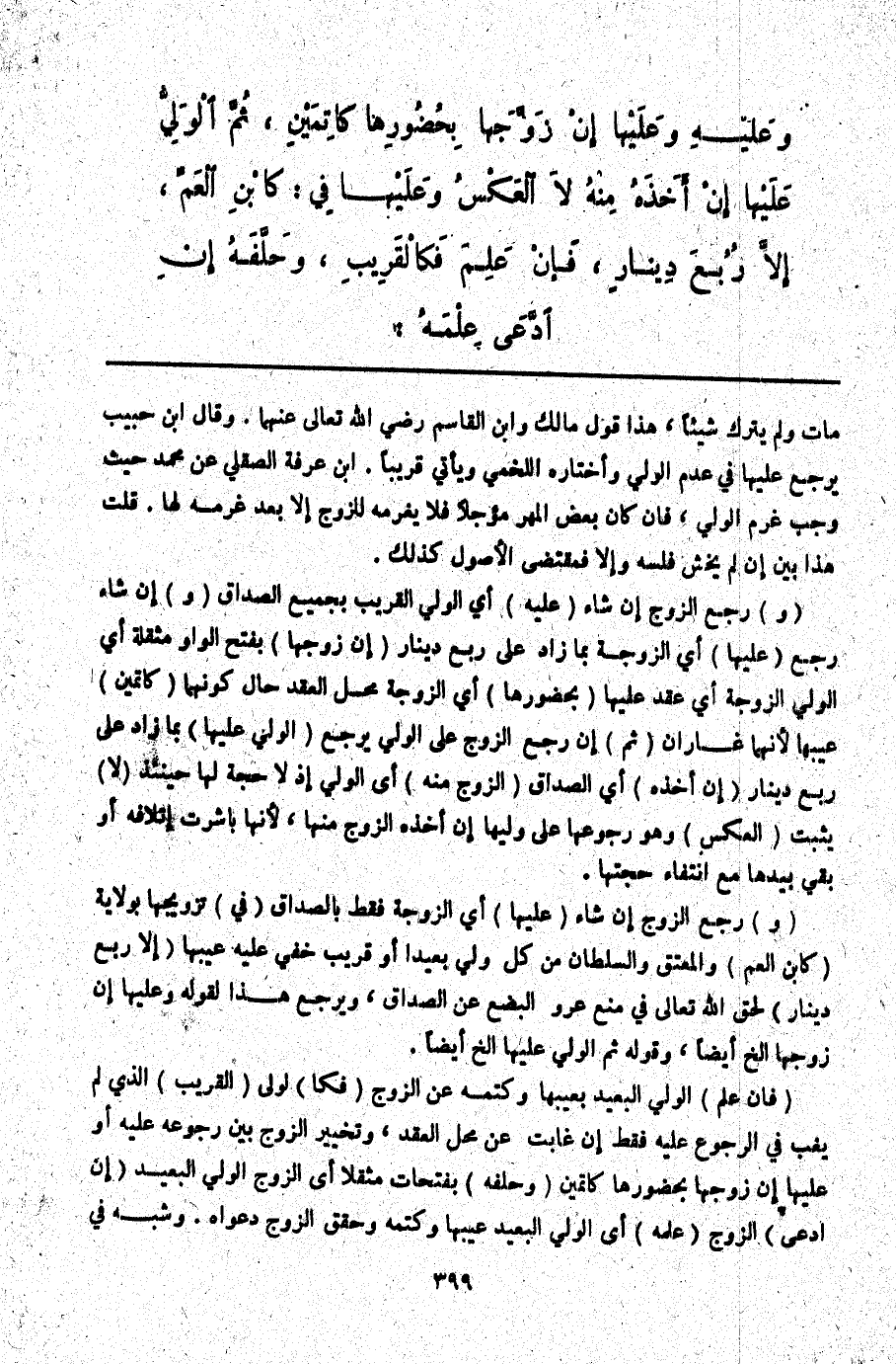 (وَ) رَجَعَ الزَّوْجُ إنْ شَاءَ (عَلَيْهَا) أَيْ الزَّوْجَةِ فَقَطْ بِالصَّدَاقِ (فِي) تَزْوِيجِهَا بِوِلَايَةٍ (كَابْنِ الْعَمِّ) وَالْمُعْتَقِ وَالسُّلْطَانِ مِنْ كُلِّ وَلِيٍّ بَعِيدًا أَوْ قَرِيبًا خَفِيَ عَلَيْهِ عَيْبُهَا (إلَّا رُبْعَ دِينَارٍ) لِحَقِّ اللَّهِ تَعَالَى فِي مَنْعِ عُرُوِّ الْبُضْعِ عَنْ الصَّدَاقِ، وَيَرْجِعُ هَذَا لِقَوْلِهِ وَعَلَيْهِمَا إنْ زَوَّجَهَا إلَخْ أَيْضًا، وَقَوْلُهُ ثُمَّ الْوَلِيُّ عَلَيْهَا إلَخْ أَيْضًا.