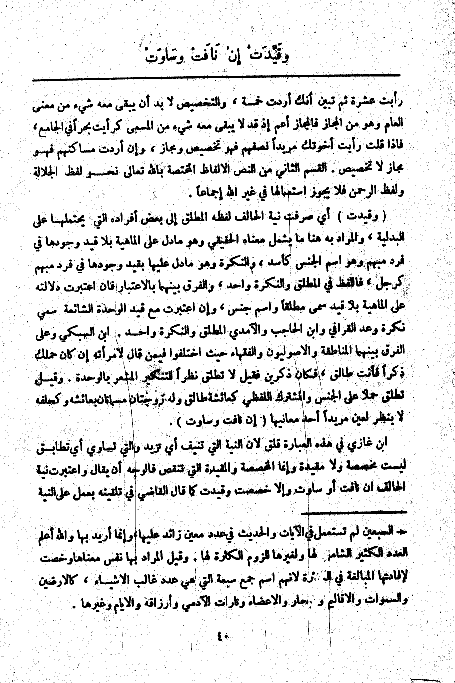 ـــــــــــــــــــــــــــــQرَأَيْت عَشْرَةً ثُمَّ تُبَيِّنُ أَنَّك أَرَدْت خَمْسَةً، وَالتَّخْصِيصُ لَا بُدَّ أَنْ يَبْقَى مَعَهُ شَيْءٌ مِنْ مَعْنَى الْعَامِّ وَهُوَ مِنْ الْمَجَازِ فَالْمَجَازُ أَعَمُّ إذْ قَدْ لَا يَبْقَى مَعَهُ شَيْءٌ مِنْ الْمُسَمَّى كَرَأَيْت بَحْرًا فِي الْجَامِعِ، فَإِذَا قُلْت رَأَيْت إخْوَتَك مُرِيدًا نِصْفَهُمْ فَهُوَ تَخْصِيصٌ وَمَجَازٌ، وَإِنْ أَرَدْت مَسَاكِنَهُمْ فَهُوَ مَجَازٌ لَا تَخْصِيصٌ.