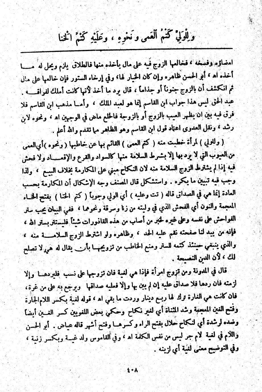 (وَلِلْوَلِيِّ) لِمَرْأَةٍ خُطِبَتْ مِنْهُ (كَتْمُ الْعَمَى) الْقَائِمِ بِهَا عَنْ خَاطِبِهَا (وَنَحْوَهُ) أَيْ الْعَمَى مِنْ الْعُيُوبِ الَّتِي لَا يُرَدُّ بِهَا إلَّا بِشَرْطِ السَّلَامَةِ مِنْهَا كَالسَّوَادِ وَالْقَرَعِ وَالْإِقْعَادِ وَلَا فَحُشَ فِيهِ إذَا لَمْ يَشْتَرِطْ الزَّوْجُ السَّلَامَةَ مِنْهُ لِأَنَّ النِّكَاحَ مَبْنِيٌّ عَلَى الْمُكَارَمَةِ بِخِلَافِ الْبَيْعِ، وَلِذَا وَجَبَ فِيهِ تَبَيُّنُ مَا يُكْرَهُ. وَاسْتُشْكِلَ قَالَ الْمُصَنِّفُ وَجْهُ الْإِشْكَالِ أَنَّ الْمُكَارَمَةَ بِحَسَبِ الْعَادَةِ إنَّمَا هِيَ فِي الصَّدَاقِ قَالَهُ (تت وَعَلَيْهِ) أَيْ الْوَلِيِّ وُجُوبًا (كَتْمُ الْخَنَا) بِفَتْحِ الْخَاءِ الْمُعْجَمَةِ وَالنُّونِ أَيْ الْفُحْشِ الَّذِي فِي وَلِيَّتِهِ مِنْ زِنًا وَسَرِقَةٍ وَنَحْوِهِمَا، فَفِي الْبَيَانِ يَجِبُ سِتْرُ الْفَوَاحِشِ عَلَى نَفْسِهِ وَعَلَى غَيْرِهِ لِخَبَرِ «مَنْ أَصَابَ مِنْ هَذِهِ الْقَاذُورَاتِ شَيْئًا فَلْيَسْتَتِرْ بِسِتْرِ اللَّهِ، فَإِنَّهُ مَنْ يُبْدِ لَنَا صَفْحَتَهُ نُقِمْ عَلَيْهِ الْحَدَّ» ، وَظَاهِرُهُ وَلَوْ اشْتَرَطَ الزَّوْجُ السَّلَامَةَ مِنْهُ، وَاَلَّذِي يَنْبَغِي حِينَئِذٍ كَتْمُهُ لِلسِّتْرِ وَمَنْعُ الْخَاطِبِ مِنْ تَزْوِيجِهَا بِأَنْ يُقَالَ لَهُ هِيَ لَا تَصْلُحُ لَك لِأَنَّ الدِّينَ النَّصِيحَةُ.