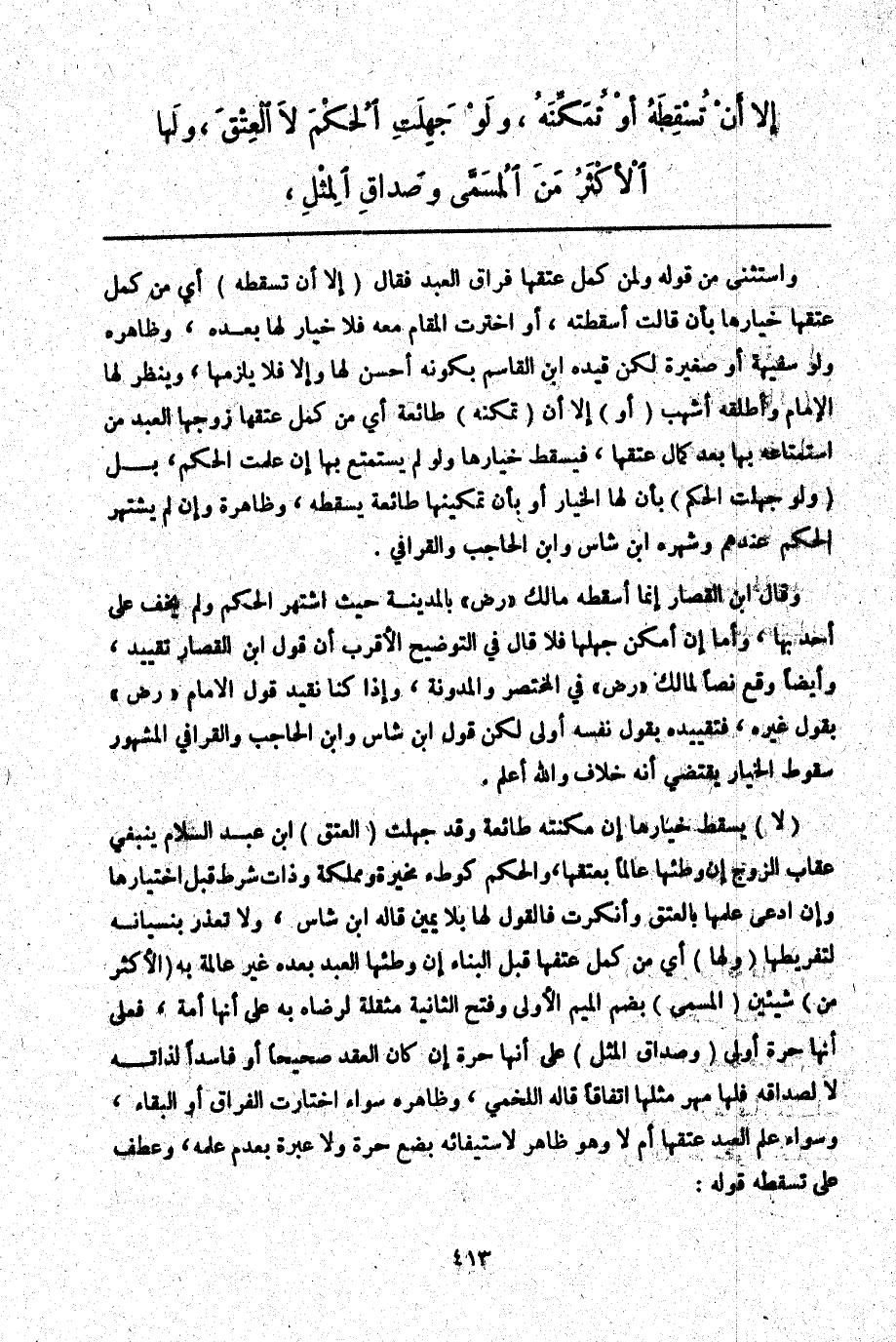 ـــــــــــــــــــــــــــــQوَاسْتَثْنَى مِنْ قَوْلِهِ وَلِمَنْ كَمُلَ عِتْقُهَا فِرَاقُ الْعَبْدِ فَقَالَ (إلَّا أَنْ تُسْقِطَهُ) أَيْ مَنْ كَمُلَ عِتْقُهَا خِيَارَهَا بِأَنْ قَالَتْ أَسْقَطْته، أَوْ اخْتَرْت الْمُقَامَ مَعَهُ فَلَا خِيَارَ لَهَا بَعْدَهُ وَظَاهِرُهُ وَلَوْ سَفِيهَةً أَوْ صَغِيرَةً لَكِنْ قَيَّدَهُ ابْنُ الْقَاسِمِ بِكَوْنِهِ أَحْسَنَ لَهَا وَإِلَّا فَلَا يَلْزَمُهَا، وَيَنْظُرُ لَهَا الْإِمَامُ وَأَطْلَقَهُ أَشْهَبُ (أَوْ) إلَّا أَنْ (تُمَكِّنَهُ) طَائِعَةً أَيْ مَنْ كَمُلَ عِتْقُهَا زَوْجَهَا الْعَبْدَ مِنْ اسْتِمْتَاعِهِ بِهَا بَعْدَ كَمَالِ عِتْقِهَا، فَيُسْقِطُ خِيَارَهَا وَلَوْ لَمْ يَسْتَمْتِعْ بِهَا إنْ عَلِمَتْ الْحُكْمَ، بَلْ (وَلَوْ جَهِلَتْ الْحُكْمَ) بِأَنَّ لَهَا الْخِيَارَ أَوْ بِأَنَّ تَمْكِينَهَا طَائِعَةً يُسْقِطُهُ وَظَاهِرُهُ وَإِنْ لَمْ يَشْتَهِرْ الْحُكْمُ عِنْدَهُمْ وَشَهَرَهُ ابْنُ شَاسٍ وَابْنُ الْحَاجِبِ وَالْقَرَافِيُّ.
