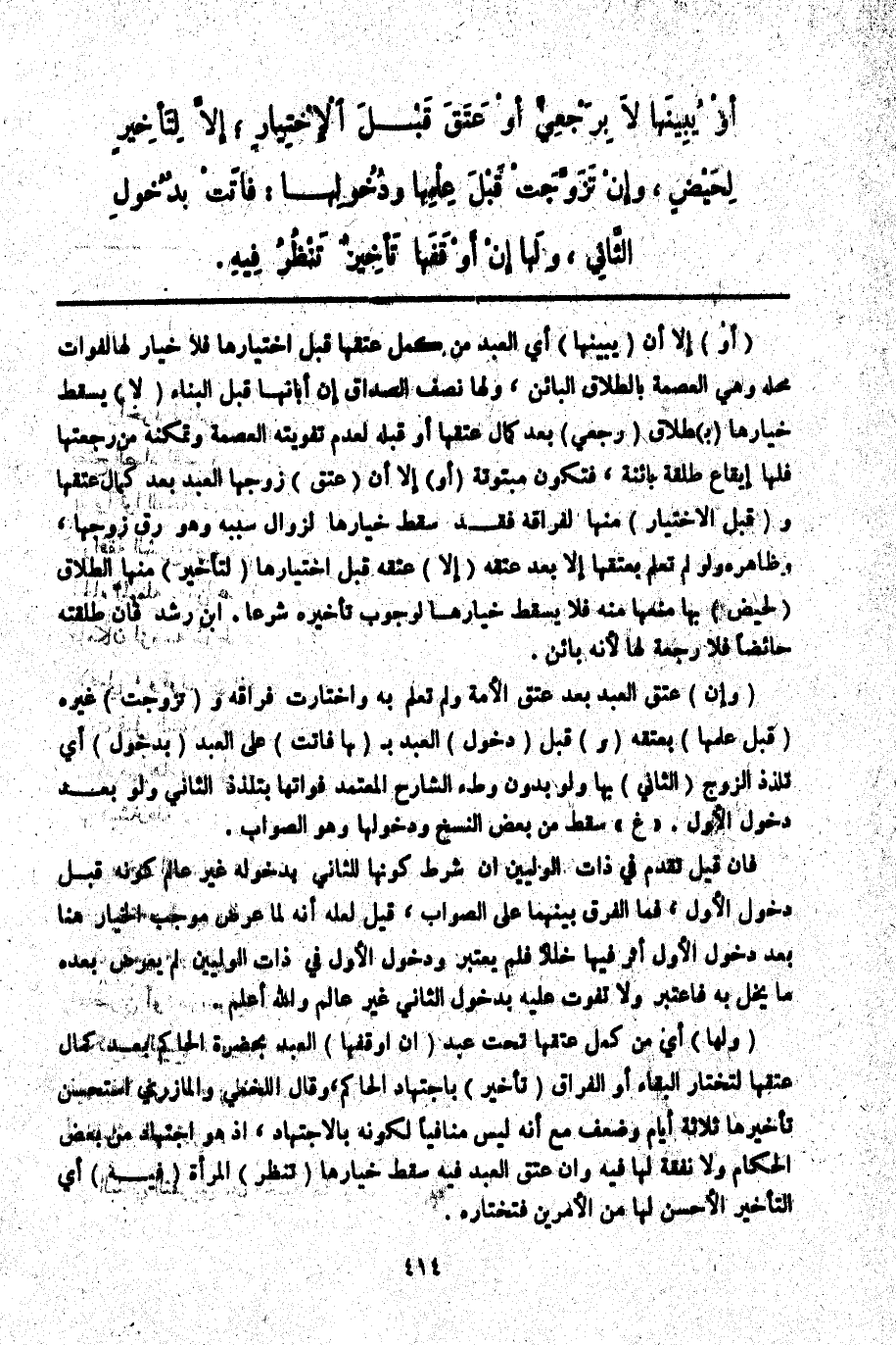 ـــــــــــــــــــــــــــــQأَوْ) إلَّا أَنْ (يُبِينَهَا) أَيْ الْعَبْدُ مَنْ كَمُلَ عِتْقُهَا قَبْلَ اخْتِيَارِهَا فَلَا خِيَارَ لَهَا لِفَوَاتِ مَحَلِّهِ وَهِيَ الْعِصْمَةُ بِالطَّلَاقِ الْبَائِنِ، وَلَهَا نِصْفُ الصَّدَاقِ إنْ أَبَانَهَا قَبْلَ الْبِنَاءِ (لَا) يَسْقُطُ خِيَارُهَا (بِ) طَلَاقٍ (رَجْعِيٍّ) بَعْدَ كَمَالِ عِتْقِهَا أَوْ قَبْلَهُ لِعَدَمِ تَفْوِيتِهِ الْعِصْمَةَ وَتَمَكُّنِهِ مِنْ رَجْعَتِهَا فَلَهَا إيقَاعُ طَلْقَةٍ بَائِنَةٍ، فَتَكُونُ مَبْتُوتَةً (أَوْ) إلَّا إنْ (عَتَقَ) زَوْجُهَا الْعَبْدَ بَعْدَ كَمَالِ عِتْقِهَا وَ (قَبْلَ الِاخْتِيَارِ) مِنْهَا لِفِرَاقِهِ فَقَدْ سَقَطَ خِيَارُهَا لِزَوَالِ سَبَبِهِ وَهُوَ رِقُّ زَوْجِهَا، وَظَاهِرُهُ وَلَوْ لَمْ تَعْلَمْ بِعِتْقِهَا إلَّا بَعْدَ عِتْقِهِ (إلَّا) عِتْقَهُ قَبْلَ اخْتِيَارِهَا (لِتَأْخِيرٍ) مِنْهَا الطَّلَاقَ (لِحَيْضٍ) بِهَا مَنَعَهَا مِنْهُ فَلَا يَسْقُطُ خِيَارُهَا لِوُجُوبِ تَأْخِيرِهِ شَرْعًا. ابْنُ رُشْدٍ فَإِنْ طَلَّقَتْهُ حَائِضًا فَلَا رَجْعَةَ لَهَا لِأَنَّهُ بَائِنٌ.
