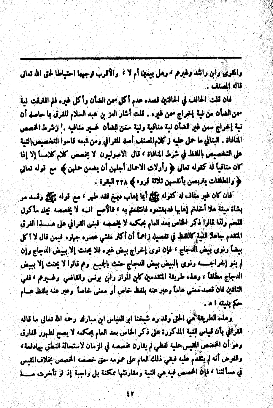 وَهَذِهِ الطَّرِيقَةُ هِيَ الْحَقُّ وَقَدْ رَدَّ شَيْخُنَا أَبُو الْعَبَّاسِ ابْنُ مُبَارَكٍ - رَحِمَهُ اللَّهُ تَعَالَى - مَا قَالَهُ الْقَرَافِيُّ بِأَنَّ قِيَاسَ النِّيَّةِ الْمَذْكُورَةِ عَلَى ذِكْرِ الْخَاصِّ بَعْدَ الْعَامِّ بِحُكْمِهِ لَا يَصِحُّ لِظُهُورِ الْفَارِقِ وَهُوَ أَنَّ الْمُخَصَّصَ الْمَقِيسَ عَلَيْهِ لَفْظِيٌّ لَمْ يُقَارِنْ مُخَصِّصَهُ فِي الزَّمَانِ لِاسْتِحَالَةِ النُّطْقِ بِهِمَا دَفْعَةً، وَالْفَرْضُ أَنَّهُ لَمْ يَتَقَدَّمْ عَلَيْهِ فَبَقِيَ ذَلِكَ الْعَامُّ عَلَى عُمُومِهِ حَتَّى خَصَّصَهُ الْمُخَصِّصُ بِخِلَافِ الْمَقِيسِ فِي مَسْأَلَتِنَا، فَإِنَّ الْمُخَصِّصَ فِيهِ هِيَ النِّيَّةُ وَمُقَارَنَتُهَا مُمْكِنَةٌ بَلْ وَاجِبَةٌ إذْ لَوْ تَأَخَّرَتْ مَا