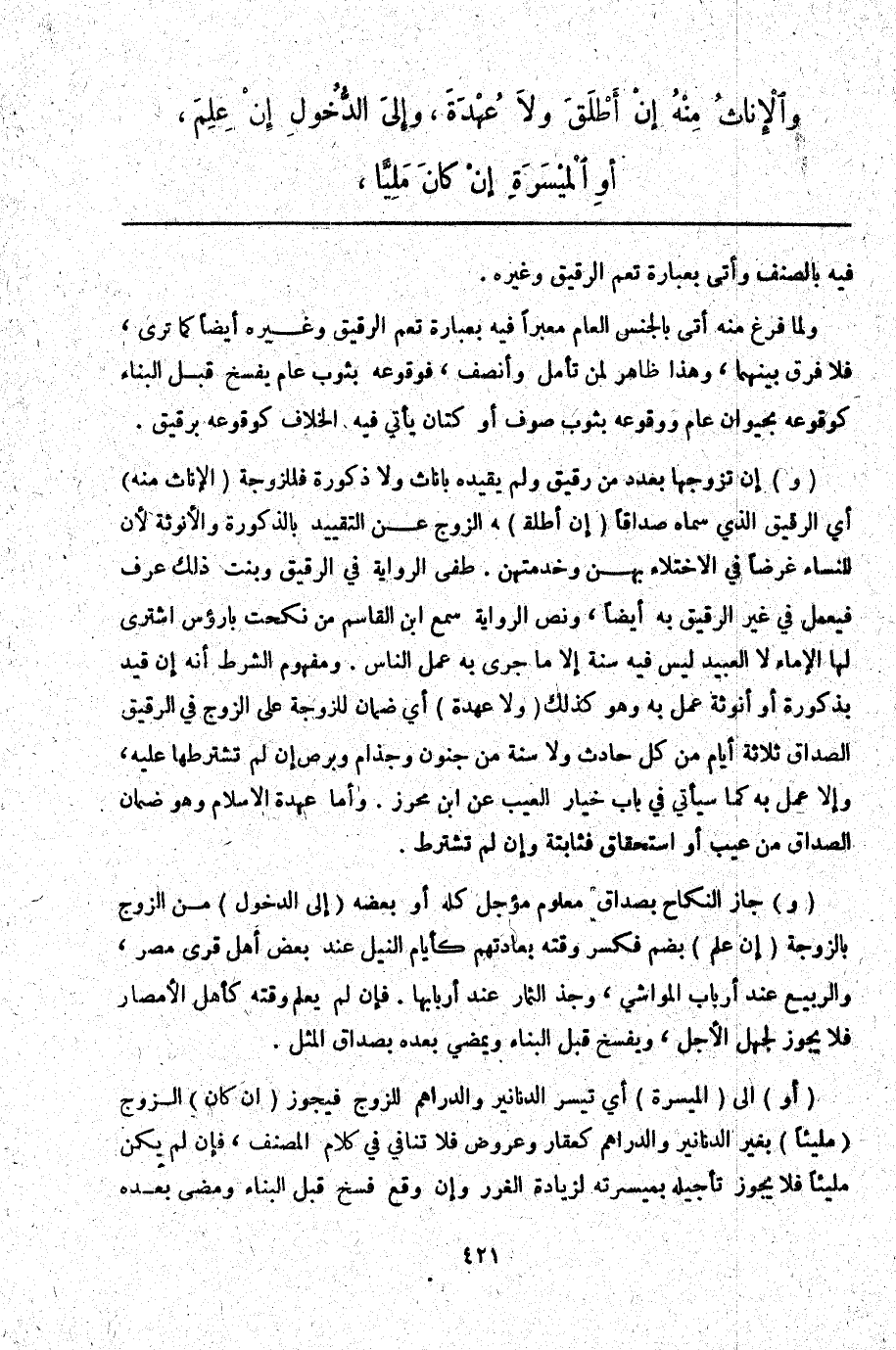 (وَ) إنْ تَزَوَّجَهَا بِعَدَدٍ مِنْ رَقِيقٍ وَلَمْ يُقَيِّدْهُ بِإِنَاثٍ وَلَا ذُكُورَةٍ فَلِلزَّوْجَةِ (الْإِنَاثُ مِنْهُ) أَيْ الرَّقِيقِ الَّذِي سَمَّاهُ صَدَاقًا (إنْ أَطْلَقَ) هـ الزَّوْجُ عَنْ التَّقْيِيدِ بِالذُّكُورَةِ وَالْأُنُوثَةِ لِأَنَّ لِلنِّسَاءِ غَرَضًا فِي الِاخْتِلَاءِ بِهِنَّ وَخِدْمَتِهِنَّ. طفي الرِّوَايَةُ فِي الرَّقِيقِ وَبِنْت ذَلِكَ عُرْفٌ فَيُعْمَلُ فِي غَيْرِ الرَّقِيقِ بِهِ أَيْضًا، وَنَصُّ الرِّوَايَةِ سَمِعَ ابْنُ الْقَاسِمِ مَنْ نُكِحَتْ بِأَرْؤُسٍ اشْتَرَى لَهَا الْإِمَاءَ لَا الْعَبِيدَ لَيْسَ فِيهِ سَنَةٌ إلَّا مَا جَرَى بِهِ عَمَلُ النَّاسِ. وَمَفْهُومُ الشَّرْطِ أَنَّهُ إنْ قُيِّدَ بِذُكُورَةٍ أَوْ أُنُوثَةٍ عُمِلَ بِهِ وَهُوَ كَذَلِكَ (وَلَا عُهْدَةَ) أَيْ ضَمَانَ لِلزَّوْجَةِ عَلَى الزَّوْجِ فِي الرَّقِيقِ الصَّدَاقِ ثَلَاثَةَ أَيَّامٍ مِنْ كُلِّ حَادِثٍ وَلَا سُنَّةَ مِنْ جُنُونٍ وَجُذَامٍ وَبَرَصٍ إنْ لَمْ تَشْتَرِطْهَا عَلَيْهِ، وَإِلَّا عُمِلَ بِهِ كَمَا سَيَأْتِي فِي بَابِ خِيَارِ الْعَيْبِ عَنْ ابْنِ مُحْرِزٍ، وَأَمَّا عُهْدَةُ الْإِسْلَامِ وَهُوَ ضَمَانُ الصَّدَاقِ مِنْ عَيْبٍ أَوْ اسْتِحْقَاقٍ فَثَابِتَةٌ وَإِنْ لَمْ تُشْتَرَطْ.