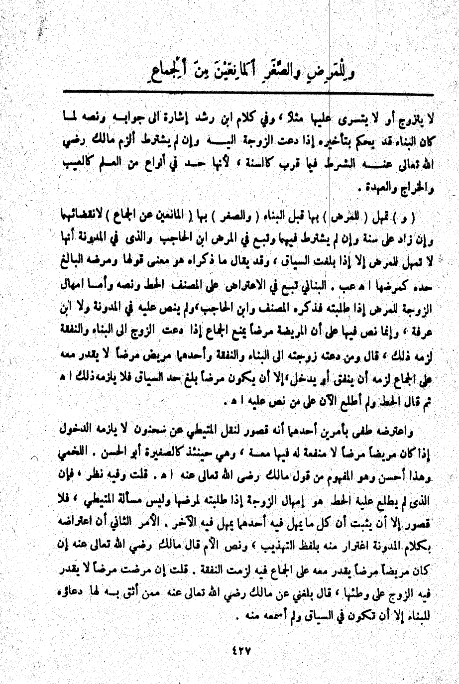 ـــــــــــــــــــــــــــــQلَا يَتَزَوَّجَ أَوْ لَا يَتَسَرَّى عَلَيْهَا مَثَلًا، وَفِي كَلَامِ ابْنِ رُشْدٍ إشَارَةٌ إلَى جَوَابِهِ وَنَصُّهُ لِمَا كَانَ الْبِنَاءُ قَدْ يُحْكَمُ بِتَأْخِيرِهِ إذَا دَعَتْ الزَّوْجَةُ إلَيْهِ وَإِنْ لَمْ يُشْتَرَطْ أَلْزَمَ مَالِكٌ - رَضِيَ اللَّهُ تَعَالَى عَنْهُ - الشَّرْطَ فِيمَا قَرُبَ كَالسَّنَةِ لِأَنَّهَا حَدٌّ فِي أَنْوَاعٍ مِنْ الْعِلْمِ كَالْعَيْبِ وَالْخَرَاجِ وَالْعُهْدَةِ.