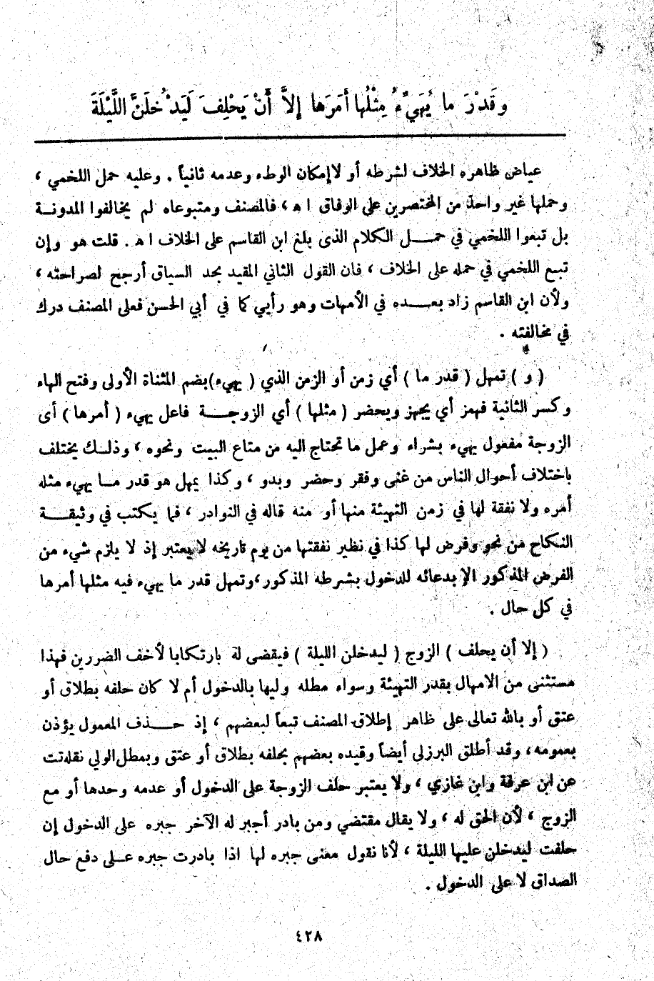 (إلَّا أَنْ يَحْلِفَ) الزَّوْجُ (لَيَدْخُلَنَّ اللَّيْلَةَ) فَيُقْضَى لَهُ ارْتِكَابًا لِأَخَفِّ الضَّرَرَيْنِ فَهَذَا مُسْتَثْنًى مِنْ الْإِمْهَالِ بِقَدْرِ التَّهْيِئَةِ وَسَوَاءٌ مَطَلَهُ وَلِيُّهَا بِالدُّخُولِ أَمْ لَا كَانَ حَلِفُهُ بِطَلَاقٍ أَوْ عِتْقٍ أَوْ بِاَللَّهِ تَعَالَى عَلَى ظَاهِرِ إطْلَاقِ الْمُصَنِّفِ تَبَعًا لِبَعْضِهِمْ، إذْ حَذْفُ الْمَعْمُولِ يُؤْذِنُ بِعُمُومِهِ، وَقَدْ أَطْلَقَ الْبُرْزُلِيُّ أَيْضًا وَقَيَّدَهُ بَعْضُهُمْ بِحَلِفِهِ بِطَلَاقٍ أَوْ عِتْقٍ وَبِمَطْلِ الْوَلِيِّ نَقَلَهُ تت عَنْ ابْنِ عَرَفَةَ وَابْنِ غَازِيٍّ، وَلَا يُعْتَبَرُ حَلِفُ الزَّوْجَةِ عَلَى الدُّخُولِ أَوْ عَدَمِهِ وَحْدَهَا أَوْ مَعَ الزَّوْجِ لِأَنَّ الْحَقَّ لَهُ، وَلَا يُقَالُ مُقْتَضَى وَمَنْ بَادَرَ أُجْبِرَ لَهُ الْآخَرُ جَبْرَهُ عَلَى الدُّخُولِ إنْ حَلَفْت لَيَدْخُلَنَّ عَلَيْهَا اللَّيْلَةَ لِأَنَّا نَقُولُ مَعْنَى جَبْرِهِ لَهَا إذَا بَادَرَتْ جَبْرَهُ عَلَى دَفْعِ حَالِّ الصَّدَاقِ لَا عَلَى الدُّخُولِ.