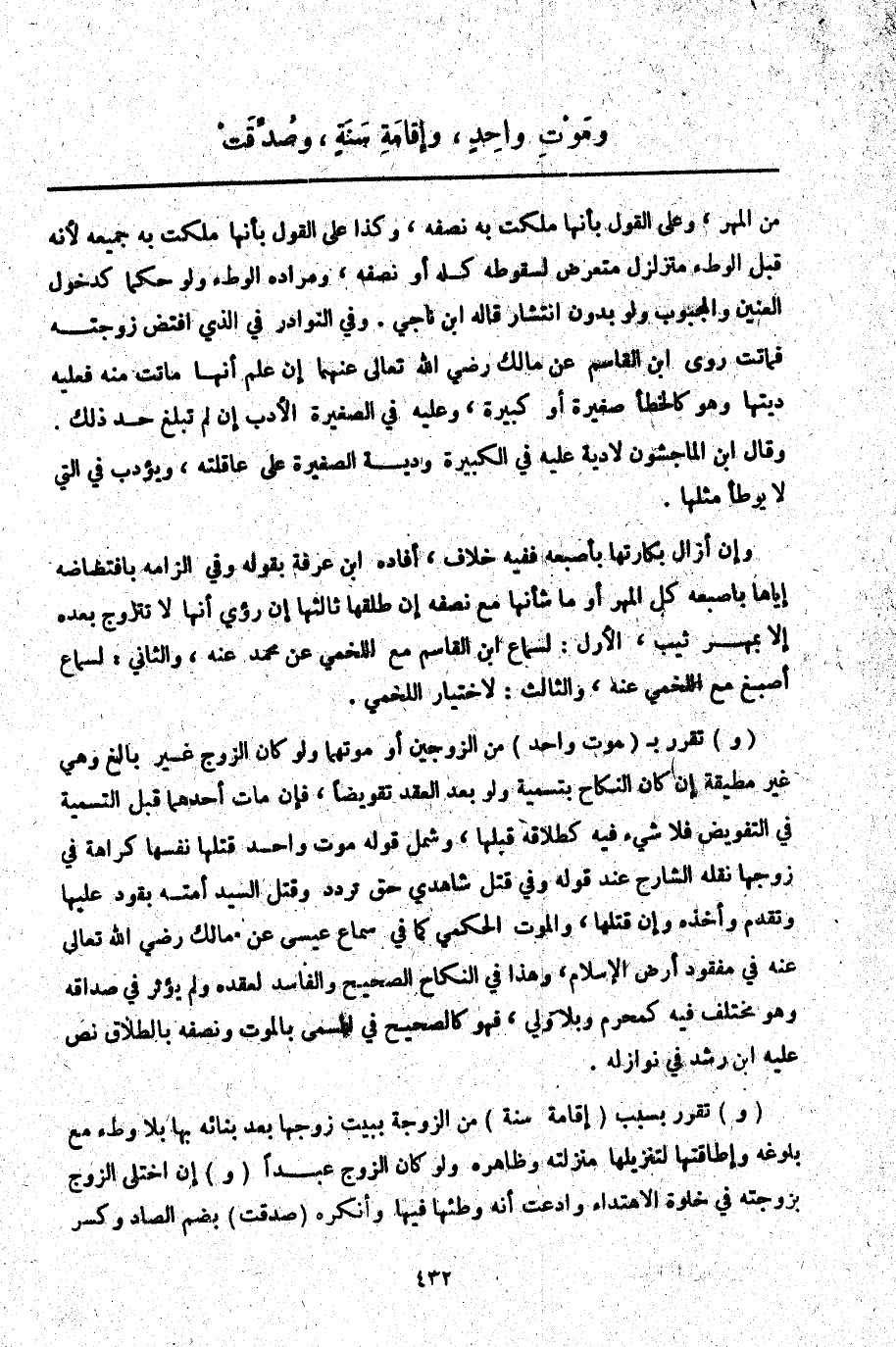 (وَ) تَقَرَّرَ بِ (مَوْتِ وَاحِدٍ) مِنْ الزَّوْجَيْنِ أَوْ مَوْتِهِمَا وَلَوْ كَانَ الزَّوْجُ غَيْرَ بَالِغٍ وَهِيَ غَيْرَ مُطِيقَةٍ إنْ كَانَ النِّكَاحُ بِتَسَمِّيهِ وَلَوْ بَعْدَ الْعَقْدِ تَفْوِيضًا، فَإِنْ مَاتَ أَحَدُهُمَا قَبْلَ التَّسْمِيَةِ فِي التَّفْوِيضِ فَلَا شَيْءَ فِيهِ كَطَلَاقِهِ قَبْلَهَا، وَشَمِلَ قَوْلُهُ مَوْتِ وَاحِدٍ قَتْلَهَا نَفْسَهَا كَرَاهَةً فِي زَوْجِهَا نَقَلَهُ الشَّارِحُ عِنْدَ قَوْلِهِ وَفِي قَتْلٍ شَاهِدَيْ حَقٍّ تَرَدُّدٌ وَقَتْلُ السَّيِّدِ أَمَتَهُ بِقَوَدٍ عَلَيْهَا وَتَقَدَّمَ وَأَخَذَهُ وَإِنْ قَتَلَهَا، وَالْمَوْتُ الْحُكْمِيُّ كَمَا فِي سَمَاعِ عِيسَى عَنْ مَالِكٍ - رَضِيَ اللَّهُ تَعَالَى عَنْهُ - فِي مَفْقُودِ أَرْضِ الْإِسْلَامِ، وَهَذَا فِي النِّكَاحِ الصَّحِيحِ وَالْفَاسِدِ لِعَقْدِهِ وَلَمْ يُؤَثِّرْ فِي صَدَاقِهِ وَهُوَ مُخْتَلَفٌ فِيهِ كَمَحْرَمٍ وَبِلَا وَلِيٍّ، فَهُوَ كَالصَّحِيحِ فِي الْمُسَمَّى بِالْمَوْتِ وَنِصْفُهُ بِالطَّلَاقِ نَصَّ عَلَيْهِ ابْنُ رُشْدٍ فِي نَوَازِلِهِ.