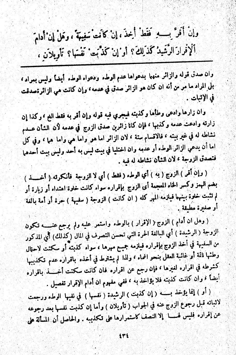 (وَهَلْ إنْ أَدَامَ) الزَّوْجُ (الْإِقْرَارَ) بِالْوَطْءِ وَاسْتَمَرَّ عَلَيْهِ وَلَمْ يَرْجِعْ عَنْهُ تَكُونُ الزَّوْجَةُ (الرَّشِيدَةُ) أَيْ الْبَالِغَةُ الْحُرَّةُ الَّتِي تُحْسِنُ التَّصَرُّفَ فِي الْمَالِ (كَذَلِكَ) أَيْ الْمَذْكُورُ مِنْ السَّفِيهَةِ فِي أَخْذِ الزَّوْجِ بِإِقْرَارِهِ فَيَلْزَمُهُ جَمِيعُ مَهْرِهَا، سَوَاءٌ كَذَّبَتْهُ أَوْ سَكَتَتْ لِاحْتِمَالِ وَطْئِهَا نَائِمَةً أَوْ غَائِبَةَ الْعَقْلِ بِنَحْوِ إغْمَاءٍ، وَلِذَا لَمْ يُشْتَرَطْ فِي أَخْذِهِ بِإِقْرَارِهِ عَدَمُ تَكْذِيبِهَا كَشَرْطِهِ فِي إقْرَارِهِ لِغَيْرِهَا، فَإِنْ رَجَعَ عَنْ إقْرَارِهِ فَإِنْ كَانَتْ سَكَتَتْ أُخِذَ بِإِقْرَارِهِ أَيْضًا، وَإِنْ كَانَتْ كَذَّبَتْهُ فَلَا يُؤَاخَذُ بِهِ، فَفِي مَفْهُومِ إنْ أَدَامَ الْإِقْرَارَ تَفْصِيلٌ.