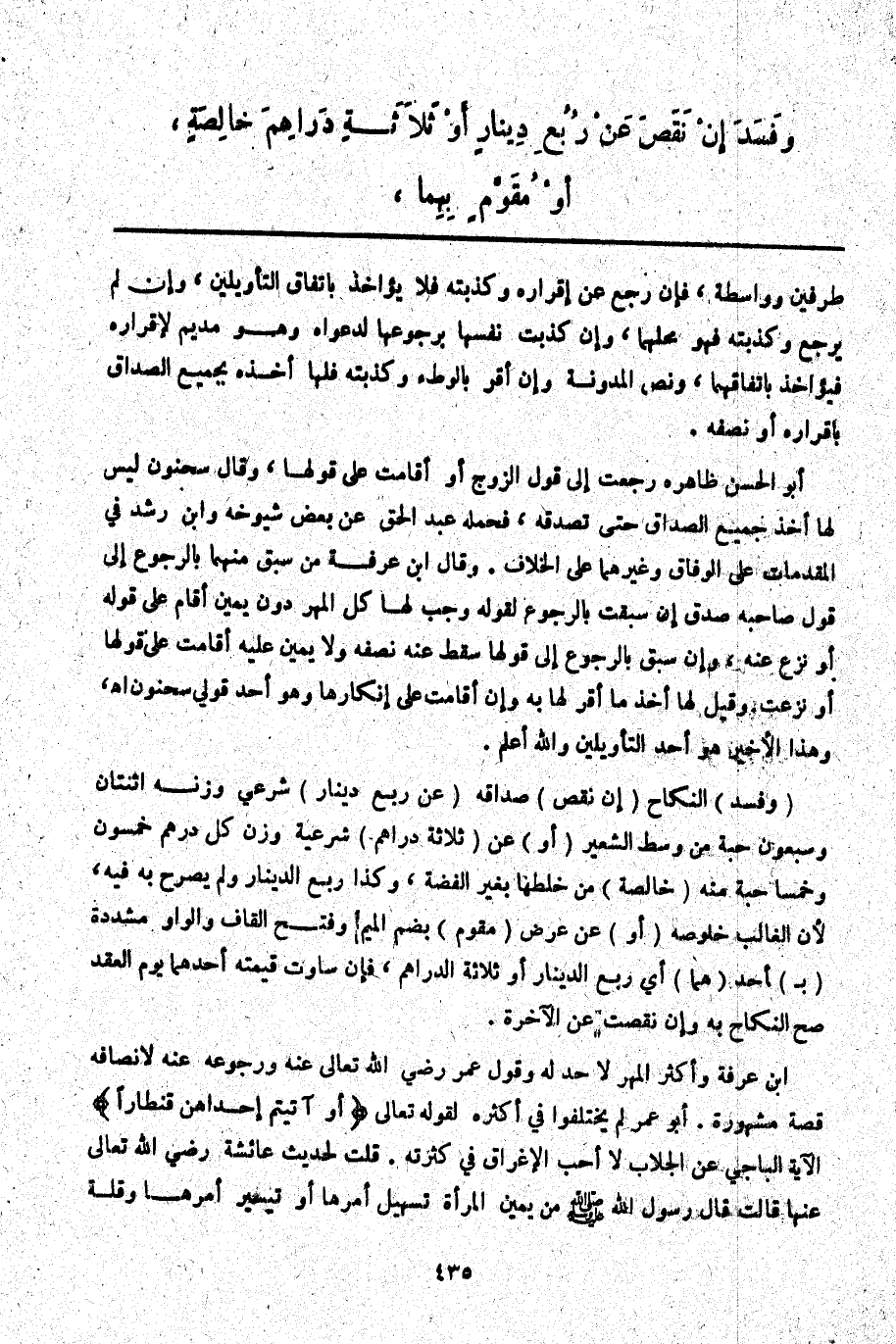 ابْنُ عَرَفَةَ وَأَكْثَرُ الْمَهْرِ لَا حَدَّ لَهُ وَقَوْلُ عُمَرَ - رَضِيَ اللَّهُ تَعَالَى عَنْهُ - وَرُجُوعُهُ عَنْهُ لِإِنْصَافِهِ قِصَّةٌ مَشْهُورَةٌ. أَبُو عُمَرَ لَمْ يَخْتَلِفُوا فِي أَكْثَرِهِ لِقَوْلِهِ تَعَالَى {وَآتَيْتُمْ إِحْدَاهُنَّ قِنْطَارًا} [النساء: 20] الْآيَةَ الْبَاجِيَّ عَنْ الْجَلَّابِ لَا أُحِبُّ الْإِغْرَاقَ فِي كَثْرَتِهِ. قُلْت لِحَدِيثِ عَائِشَةَ - رَضِيَ اللَّهُ تَعَالَى عَنْهَا - قَالَتْ «قَالَ رَسُولُ اللَّهِ - صَلَّى اللَّهُ عَلَيْهِ وَسَلَّمَ - مِنْ يُمْنِ الْمَرْأَةِ تَسْهِيلُ أَمْرِهَا أَوْ تَيْسِيرُ أَمْرِهَا وَقِلَّةُ
