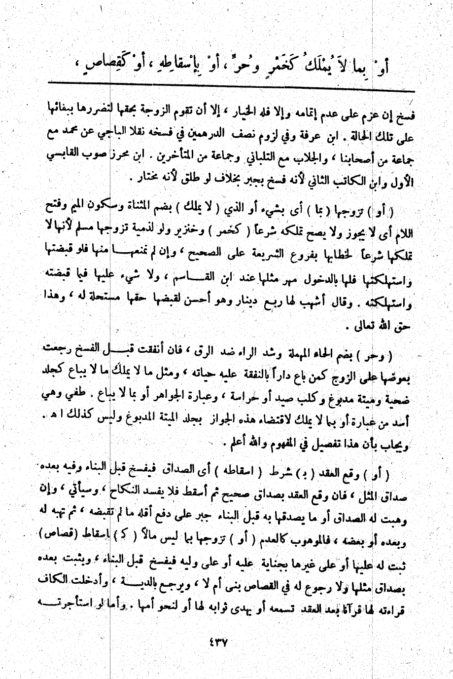 (وَحُرٍّ) بِضَمِّ الْحَاءِ الْمُهْمَلَةِ وَشَدِّ الرَّاءِ ضِدُّ الرِّقِّ، فَإِنْ أَنْفَقَتْ قَبْلَ الْفَسْخِ رَجَعَتْ بِعِوَضِهَا عَلَى الزَّوْجِ كَمَنْ بَاعَ دَارًا بِالنَّفَقَةِ عَلَيْهِ حَيَاتَهُ، وَمِثْلُ مَا لَا يُمْلَكُ مَا لَا يُبَاعُ كَجِلْدِ ضَحِيَّةٍ وَمَيْتَةِ مَدْبُوغٍ وَكَلْبِ صَيْدٍ أَوْ حِرَاسَةٍ، وَعِبَارَةُ الْجَوَاهِرِ أَوْ بِمَا لَا يُبَاعُ. طفي وَهِيَ أَشَدُّ مِنْ عِبَارَةِ أَوْ بِمَا لَا يُمْلَكُ لِاقْتِضَاءِ هَذِهِ الْجَوَازَ بِجِلْدِ الْمَيْتَةِ الْمَدْبُوغِ وَلَيْسَ كَذَلِكَ اهـ. وَيُجَابُ بِأَنَّ هَذَا تَفْصِيلٌ فِي الْمَفْهُومِ وَاَللَّهُ أَعْلَمُ.