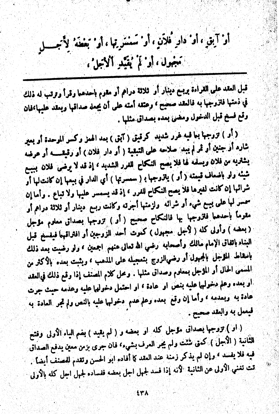 (أَوْ) تَزَوَّجَهَا بِصَدَاقٍ مَعْلُومٍ مُؤَجَّلٍ (بَعْضُهُ) وَأَوْلَى كُلُّهُ (لِأَجَلٍ مَجْهُولٍ) كَمَوْتِ أَحَدِ الزَّوْجَيْنِ أَوْ افْتِرَاقِهِمَا فَيُفْسَخُ قَبْلَ الْبِنَاءِ بِاتِّفَاقِ الْإِمَامِ مَالِكٍ وَأَصْحَابِهِ رَضِيَ اللَّهُ تَعَالَى عَنْهُمْ أَجْمَعِينَ، وَلَوْ رَضِيَتْ بَعْدَ ذَلِكَ بِإِسْقَاطِ الْمُؤَجَّلِ بِالْمَجْهُولِ أَوْ رَضِيَ الزَّوْجُ بِتَعْجِيلِهِ عَلَى الْمَذْهَبِ، وَيَثْبُتُ بَعْدَهُ بِالْأَكْثَرِ مِنْ الْمُسَمَّى الْحَالِّ أَوْ الْمُؤَجَّلِ بِمَعْلُومٍ وَصَدَاقِ مِثْلِهَا. وَمَحَلُّ كَلَامِ الْمُصَنِّفِ إذَا وَقَعَ ذَلِكَ فِي الْعَقْدِ أَوْ بَعْدَهُ وَعُلِمَ دُخُولُهُمَا عَلَيْهِ بِنَصٍّ أَوْ عَادَةٍ، أَوْ اُحْتُمِلَ دُخُولُهُمَا عَلَيْهِ وَعَدَمُهُ حَيْثُ جَرَتْ عَادَةٌ بِهِ وَبِعَدَمِهِ، وَأَمَّا إنْ وَقَعَ بَعْدَهُ وَعُلِمَ عَدَمُ دُخُولِهِمَا عَلَيْهِ بِالنَّصِّ وَلَمْ تَجْرِ الْعَادَةُ بِهِ فَيُعْمَلُ بِهِ وَالْعَقْدُ صَحِيحٌ.