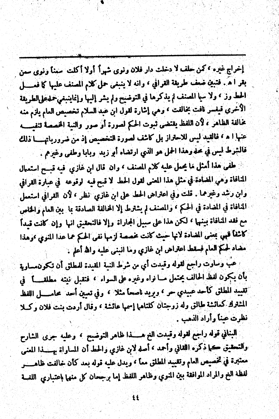 ـــــــــــــــــــــــــــــQإخْرَاجَ غَيْرِهِ، كَمَنْ حَلَفَ لَا دَخَلْت دَارَ فُلَانٍ وَنَوَى شَهْرًا أَوْ لَا أَكَلَتْ سَمْنًا وَنَوَى سَمْنَ بَقَرٍ اهـ. فَتَبَيَّنَ ضَعْفُ طَرِيقَةِ الْقَرَافِيِّ، وَأَنَّهُ لَا يَنْبَغِي حَمْلُ كَلَامِ الْمُصَنِّفِ عَلَيْهَا كَمَا فَعَلَ الْحَطّ وز، وَلَا سِيَّمَا الْمُصَنِّفُ لَمْ يَذْكُرْهَا فِي التَّوْضِيحِ وَلَمْ يُشِرْ إلَيْهَا وَإِنَّمَا يَنْبَغِي حَمْلُهُ عَلَى الطَّرِيقَةِ الْأُخْرَى فَيُفَسِّرُ نَافَتْ بِخَالَفَتْ، وَهِيَ إشَارَةٌ لِقَوْلِ ابْنِ عَبْدِ السَّلَامِ تَخْصِيصُ الْعَامِّ يَلْزَمُ مِنْهُ مُخَالَفَةُ الظَّاهِرِ لِأَنَّ اللَّفْظَ يَقْتَضِي ثُبُوتَ الْحُكْمِ لِصُورَةٍ أَوْ صُوَرٍ وَالنِّيَّةُ الْمُخَصِّصَةُ تَنْفِيهِ عَنْهَا. اهـ. فَالْقَيْدُ لَيْسَ لِلِاحْتِرَازِ بَلْ كَاشِفٌ لِصُورَةِ التَّخْصِيصِ إذْ مِنْ ضَرُورِيَّاتِهَا ذَلِكَ فَالشَّرْطُ لَيْسَ فِي مَحِلِّهِ وَهَذَا الْحَمْلُ هُوَ الَّذِي ارْتَضَاهُ أَبُو زَيْدٍ وَبَابَا وطفي وَغَيْرُهُمْ.