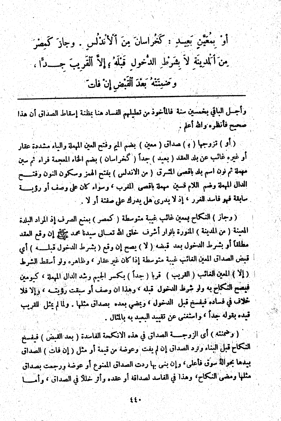 (أَوْ) تَزَوَّجَهَا (بِ) صَدَاقٍ (مُعَيَّنٍ) بِضَمِّ الْمِيمِ وَفَتْحِ الْعَيْنِ الْمُهْمَلَةِ وَالْيَاءِ مُشَدَّدَةً عَقَارٍ أَوْ غَيْرِهِ غَائِبٍ عَنْ بَلَدِ الْعَقْدِ (بَعِيدٍ) جِدًّا (كَخُرَاسَانَ) بِضَمِّ الْخَاءِ الْمُعْجَمَةِ فِرَاءٍ ثُمَّ سِينٍ مُهْمَلَةٍ ثُمَّ نُونٍ اسْمُ بَلَدٍ بِأَقْصَى الْمَشْرِقِ (مِنْ الْأَنْدَلُسِ) بِفَتْحِ الْهَمْزِ وَسُكُونِ النُّونِ وَفَتْحِ الدَّالِ الْمُهْمَلَةِ وَضَمِّ اللَّامِ فَسِينٍ مُهْمَلَةٍ بِأَقْصَى الْمَغْرِبِ، وَسَوَاءٌ كَانَ عَلَى وَصْفٍ أَوْ رُؤْيَةٍ سَابِقَةٍ فَهُوَ فَاسِدٌ لِلْغَرَرِ، إذْ لَا يَدْرِي هَلْ يُدْرَكُ عَلَى صِفَتِهِ أَوْ لَا.