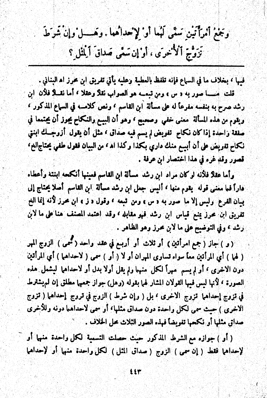 قُلْت مَا صَوَّرَ بِهِ " س " وَمَنْ تَبِعَهُ هُوَ الصَّوَابُ نَقْلًا وَعَقْلًا، أَمَّا نَقْلًا فَلِأَنَّ ابْنَ رُشْدٍ صَرَّحَ بِهِ بِنَفْسِهِ مُفَرِّعًا لَهُ عَلَى مَسْأَلَةِ ابْنِ الْقَاسِمِ، وَنَصُّ كَلَامِهِ فِي السَّمَاعِ الْمَذْكُورِ، وَيَقُومُ مِنْ هَذِهِ الْمَسْأَلَةِ مَعْنًى خَفِيٌّ وَصَحِيحٌ، وَهُوَ أَنَّ الْبَيْعَ وَالنِّكَاحَ يَجُوزُ أَنْ يَجْتَمِعَا فِي صَفْقَةٍ وَاحِدَةٍ إذَا كَانَ نِكَاحَ تَفْوِيضٍ لَمْ يُسَمَّ فِيهِ صَدَاقٌ، مِثْلُ أَنْ يَقُولَ أُزَوِّجُك ابْنَتِي نِكَاحَ تَفْوِيضٍ عَلَى أَنْ أَبِيعَ مِنْك دَارِي بِكَذَا وَكَذَا. اهـ. مِنْ الْبَيَانِ فَقَوْلُ طفي يَحْتَاجُ إلَخْ، قُصُورٌ وَقَدْ غَرَّهُ فِي هَذَا اخْتِصَارُ ابْنِ عَرَفَةَ.