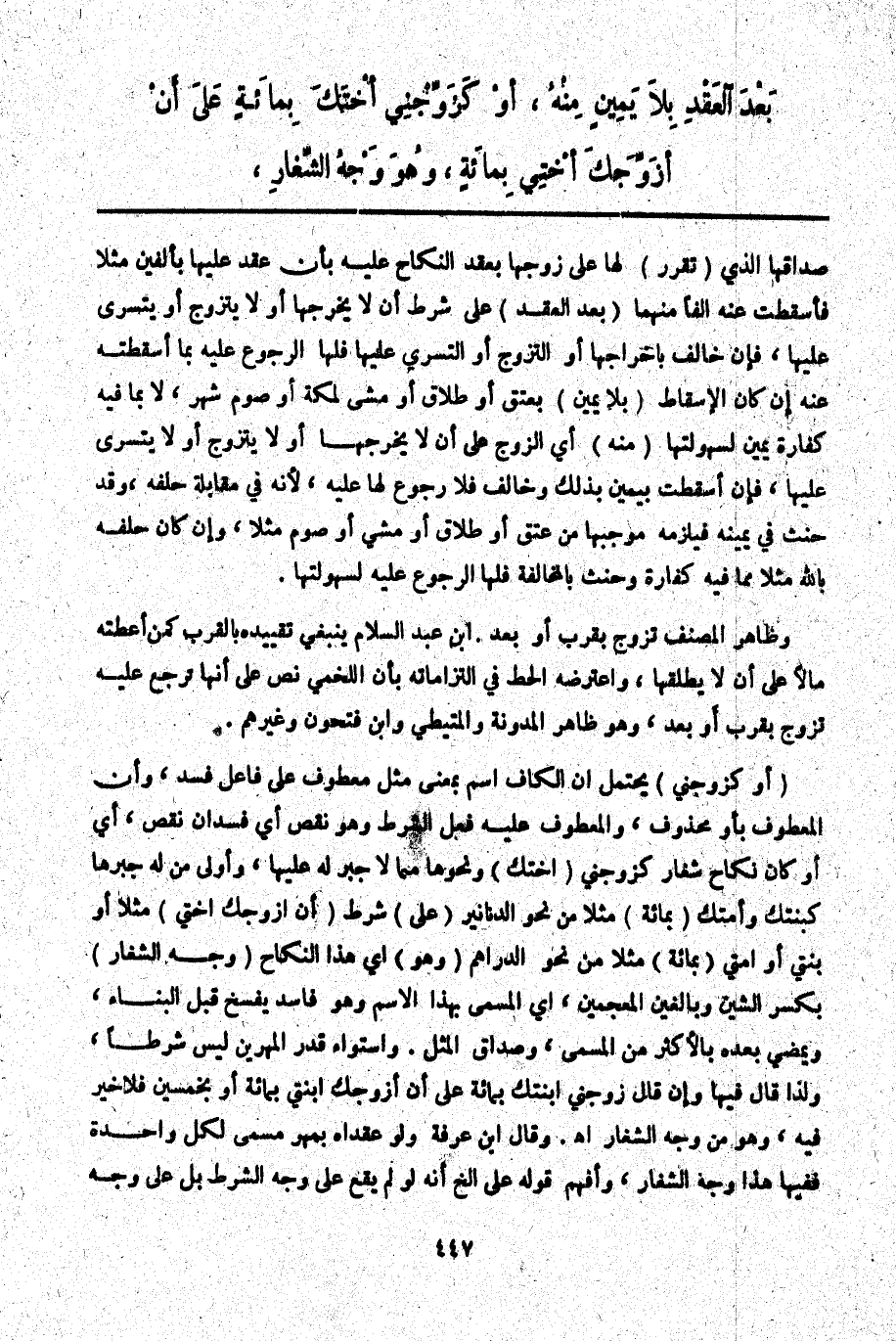 (أَوْ كَزَوِّجْنِي) يُحْتَمَلُ أَنَّ الْكَافَ اسْمٌ بِمَعْنَى مِثْلِ مَعْطُوفٌ عَلَى فَاعِلِ فَسَدَ، وَأَنَّ الْمَعْطُوفَ بِأَوْ مَحْذُوفٌ، وَالْمَعْطُوفُ عَلَيْهِ فِعْلُ الشَّرْطِ وَهُوَ نَقْصٌ أَيْ فَسَدَ إنْ نَقَصَ، أَيْ أَوْ كَانَ نِكَاحَ شِغَارٍ كَزَوِّجْنِي (أُخْتَك) وَنَحْوَهَا مِمَّا لَا جَبْرَ لَهُ عَلَيْهَا، وَأَوْلَى مَنْ لَهُ جَبْرُهَا كَبِنْتِك وَأَمَتِك (بِمِائَةٍ) مَثَلًا مِنْ نَحْوِ الدَّنَانِيرِ (عَلَى) شَرْطِ (أَنْ أُزَوِّجَك أُخْتِي) مَثَلًا أَوْ بِنْتِي أَوْ أَمَتِي (بِمِائَةٍ) مَثَلًا مِنْ نَحْوِ الدَّرَاهِمِ (وَهُوَ) أَيْ هَذَا النِّكَاحُ (وَجْهُ الشِّغَارِ) بِكَسْرِ الشِّينِ وَبِالْغَيْنِ الْمُعْجَمَيْنِ، أَيْ الْمُسَمَّى بِهَذَا الِاسْمِ وَهُوَ فَاسِدٌ يُفْسَخُ قَبْلَ الْبِنَاءِ، وَيَمْضِي بَعْدَهُ بِالْأَكْثَرِ مِنْ الْمُسَمَّى، وَصَدَاقِ الْمِثْلِ. وَاسْتِوَاءُ قَدْرِ الْمَهْرَيْنِ لَيْسَ شَرْطًا، وَلِذَا قَالَ فِيهَا وَإِنْ قَالَ زَوِّجْنِي ابْنَتَك بِمِائَةٍ عَلَى أَنْ أُزَوِّجَك ابْنَتِي بِمِائَةٍ أَوْ بِخَمْسِينَ فَلَا خَيْرَ فِيهِ، وَهُوَ مِنْ وَجْهِ الشِّغَارِ اهـ. وَقَالَ ابْنُ عَرَفَةَ وَلَوْ عَقَدَاهُ بِمَهْرٍ مُسَمًّى لِكُلِّ وَاحِدَةٍ فَفِيهَا هَذَا وَجْهُ الشِّغَارِ، وَأَفْهَمَ قَوْلُهُ عَلَى إلَخْ أَنَّهُ لَوْ لَمْ يَقَعْ عَلَى وَجْهِ الشَّرْطِ بَلْ عَلَى وَجْهِ
