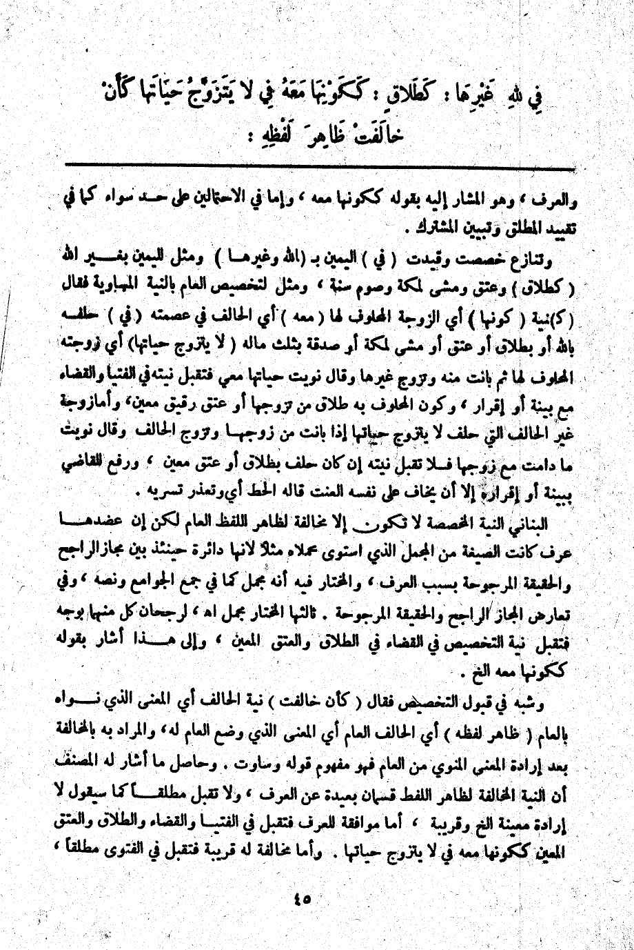 الْبُنَانِيُّ النِّيَّةُ الْمُخَصِّصَةُ لَا تَكُونُ إلَّا مُخَالِفَةً لِظَاهِرِ اللَّفْظِ الْعَامِّ لَكِنْ إنْ عَضَّدَهَا عُرْفٌ كَانَتْ الصِّيغَةُ مِنْ الْمُجْمَلِ الَّذِي اسْتَوَى مَحْمِلَاهُ مَثَلًا لِأَنَّهَا دَائِرَةٌ حِينَئِذٍ بَيْنَ مَجَازِ الرَّاجِحِ وَالْحَقِيقَةِ الْمَرْجُوحَةِ بِسَبَبِ الْعُرْفِ وَالْمُخْتَارُ فِيهِ أَنَّهُ مُجْمَلٌ كَمَا فِي جَمْعِ الْجَوَامِعِ وَنَصُّهُ، وَفِي تَعَارُضِ الْمَجَازِ الرَّاجِحِ وَالْحَقِيقَةِ الْمَرْجُوحَةِ. ثَالِثُهَا الْمُخْتَارُ مُجْمَلٌ. اهـ. لِرُجْحَانِ كُلٍّ مِنْهُمَا بِوَجْهٍ فَتُقْبَلُ نِيَّةُ التَّخْصِيصِ فِي الْقَضَاءِ فِي الطَّلَاقِ وَالْعِتْقِ الْمُعَيَّنِ، وَإِلَى هَذَا أَشَارَ بِقَوْلِهِ كَكَوْنِهَا مَعَهُ إلَخْ.