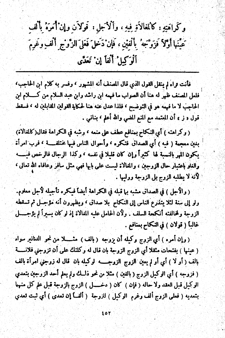 (وَكَرَاهَتِهِ) أَيْ النِّكَاحِ بِمَنَافِعَ عَطْفٌ عَلَى مَنْعِهِ، وَشَبَّهَ فِي الْكَرَاهَةِ فَقَالَ (كَالْمُغَالَاةِ) بِغَيْنٍ مُعْجَمَةٍ (فِيهِ) أَيْ الصَّدَاقِ فَتُكْرَهُ، وَأَحْوَالُ النَّاسِ فِيهَا مُخْتَلِفَةٌ، فَرُبَّ امْرَأَةٍ يَكُونُ الْمَهْرُ بِالنِّسْبَةِ لَهَا كَثِيرًا وَإِنْ كَانَ قَلِيلًا فِي نَفْسِهِ، وَكَذَا الرِّجَالُ فَالرُّخْصُ فِيهِ وَالْغُلُوُّ بِاعْتِبَارِ حَالِ الزَّوْجَيْنِ، وَالْمُغَالَاةُ لَيْسَتْ عَلَى بَابِهَا فَهِيَ مَثَلٌ سَافِرٌ وَعَافَاهُ اللَّهُ تَعَالَى لِأَنَّهُ لَا يَطْلُبُهُ الزَّوْجُ بَلْ الزَّوْجَةُ وَوَلِيُّهَا.