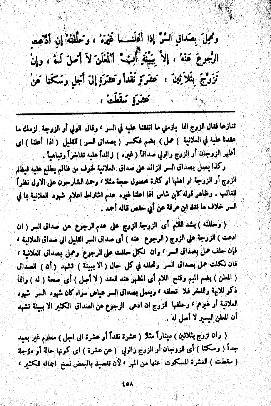 (وَحَلَّفَتْهُ) بِشَدِّ اللَّامِ أَيْ الزَّوْجَةُ الزَّوْجَ عَلَى عَدَمِ الرُّجُوعِ عَنْ صَدَاقِ السِّرِّ (إنْ ادَّعَتْ) الزَّوْجَةُ عَلَى الزَّوْجِ (الرُّجُوعَ عَنْهُ) أَيْ صَدَاقِ السِّرِّ الْقَلِيلِ إلَى صَدَاقِ الْعَلَانِيَةِ، فَإِنْ حَلَفَ عُمِلَ بِصَدَاقِ السِّرِّ، وَإِنْ نَكَلَ حَلَفَتْ عَلَى الرُّجُوعِ وَعُمِلَ بِصَدَاقِ الْعَلَانِيَةِ، فَإِنْ نَكَلَتْ عُمِلَ بِصَدَاقِ السِّرِّ وَتُحَلِّفُهُ فِي كُلِّ حَالٍ (إلَّا بِبَيِّنَةٍ) تَشْهَدُ (أَنَّ) الصَّدَاقَ (الْمُعْلَنَ) بِضَمِّ الْمِيمِ وَفَتْحِ اللَّامِ أَيْ الْمُظْهَرِ عِنْدَ الْعَقْدِ (لَا أَصْلَ) أَيْ صِحَّةَ (لَهُ) وَإِنَّمَا ذُكِرَ لِلْأُبَّهَةِ وَالْفَخْرِ فَلَا تُحَلِّفُهُ، وَيُعْمَلُ بِصَدَاقِ السِّرِّ عِيَاضٌ سَوَاءٌ كَانَ شُهُودُ السِّرِّ شُهُودَ الْعَلَانِيَةِ أَوْ غَيْرَهُمْ، وَحَلَّفَهَا الزَّوْجُ إنْ ادَّعَى الرُّجُوعَ عَنْ الصَّدَاقِ الْكَثِيرِ إلَّا بِبَيِّنَةٍ تَشْهَدُ أَنَّ الْمُعْلَنَ الْيَسِيرَ لَا أَصْلَ لَهُ.