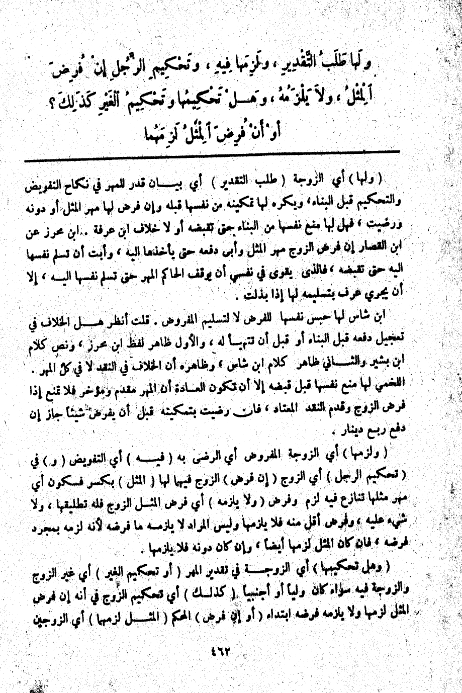 وَلَهَا طَلَبُ التَّقْدِيرِ، وَلَزِمَهَا فِيهِ، وَتَحْكِيمِ الرَّجُلِ إنْ فُرِضَ الْمِثْلُ، وَلَا يَلْزَمُهُ، وَهَلْ تَحْكِيمُهَا وَتَحْكِيمُ الْغَيْرِ كَذَلِكَ؟ أَوْ إنْ فُرِضَ الْمِثْلُ لَزِمَهُمَا