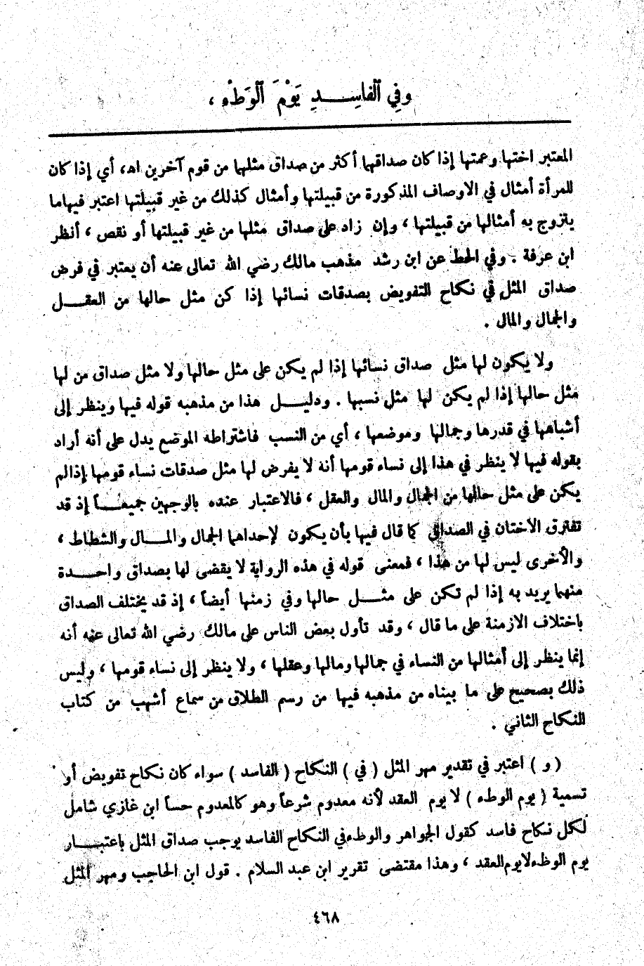 (وَ) اُعْتُبِرَ فِي تَقْدِيرِ مَهْرِ الْمِثْلِ (فِي) النِّكَاحِ (الْفَاسِدِ) سَوَاءٌ كَانَ نِكَاحَ تَفْوِيضٍ أَوْ تَسْمِيَةٍ (يَوْمَ الْوَطْءِ) لَا يَوْمَ الْعَقْدِ لِأَنَّهُ مَعْدُومٌ شَرْعًا وَهُوَ كَالْمَعْدُومِ حِسًّا ابْنُ غَازِيٍّ شَامِلٌ لِكُلِّ نِكَاحٍ فَاسِدٍ كَقَوْلِ الْجَوَاهِرِ وَالْوَطْءُ فِي النِّكَاحِ الْفَاسِدِ يُوجِبُ صَدَاقَ الْمِثْلِ بِاعْتِبَارِ يَوْمِ الْوَطْءِ لَا يَوْمِ الْعَقْدِ، وَهَذَا مُقْتَضَى تَقْرِيرِ ابْنِ عَبْدِ السَّلَامِ. قَوْلُ ابْنِ الْحَاجِبِ وَمَهْرُ الْمِثْلِ
